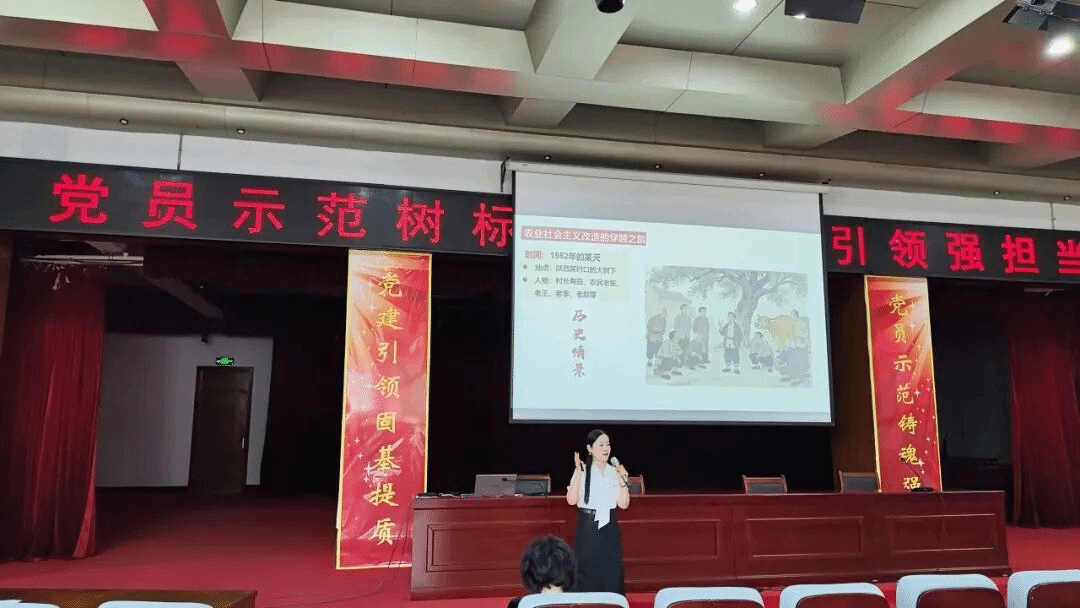 马克思主义学院概论党支部李宁艳老师以《毛泽东思想和中国特色社会主义理论体系概论——农业的社会主义改造》为题进行示范授课。李老师围绕“改天换地:社会主义改造理论如何在中国确立社会主义基本制度?”这一核心问题,采用专题化教学设计,通过歌曲导入、角色扮演等互动方式增强学生参与感,并以“问题链”贯穿教学各环节,引导学生在历史逻辑、理论逻辑与实践逻辑的统一中深化对社会主义改造的理解,增强制度自信与文化认同,实现价值塑造与理论传授的深度融合。