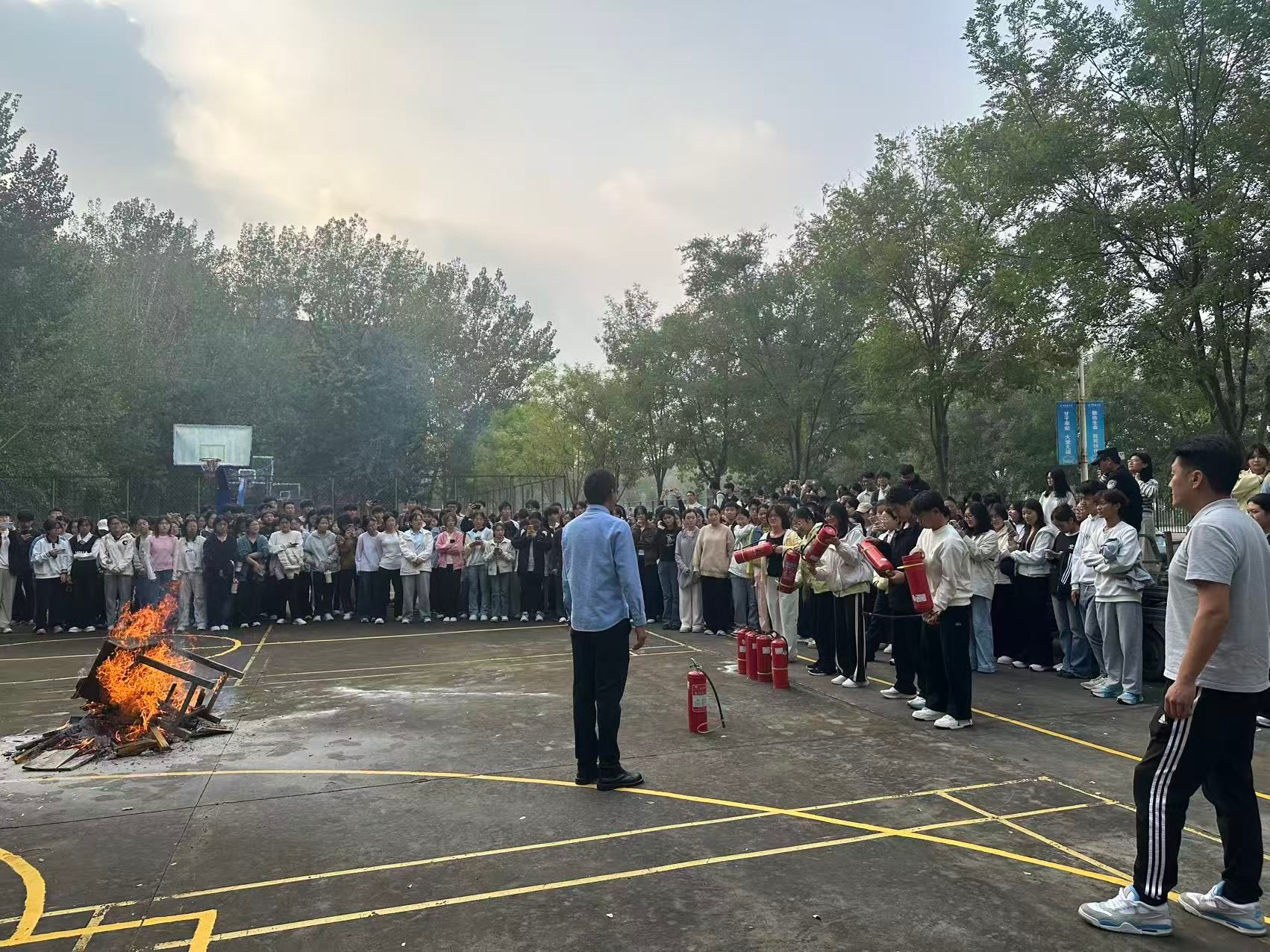 实操演练中,新生分组轮换,使用灭火器扑救模拟火源,辅导员与宿管人员同步参与。指导教员现场纠正握瓶姿势、喷射角度等操作细节,确保学生熟练掌握操作要领。