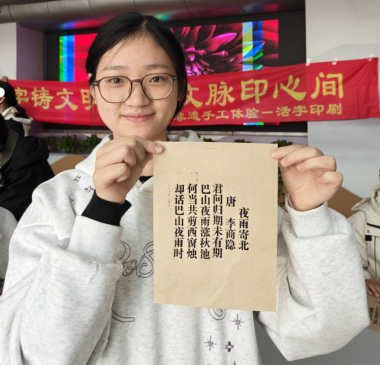 活动伊始,图书馆工作人员生动阐述了从毕昇发明活字印刷术到广泛传播推广的完整演变历程,讲解了活字印刷术的基本原理,帮助同学们加深理解认识。随后,同学们两人一组,相互协作完成活字排版,用棕刷蘸取油墨,在排好的版上均匀刷墨、铺纸、轻压、揭页,一幅幅带着墨香的古诗跃然纸上。