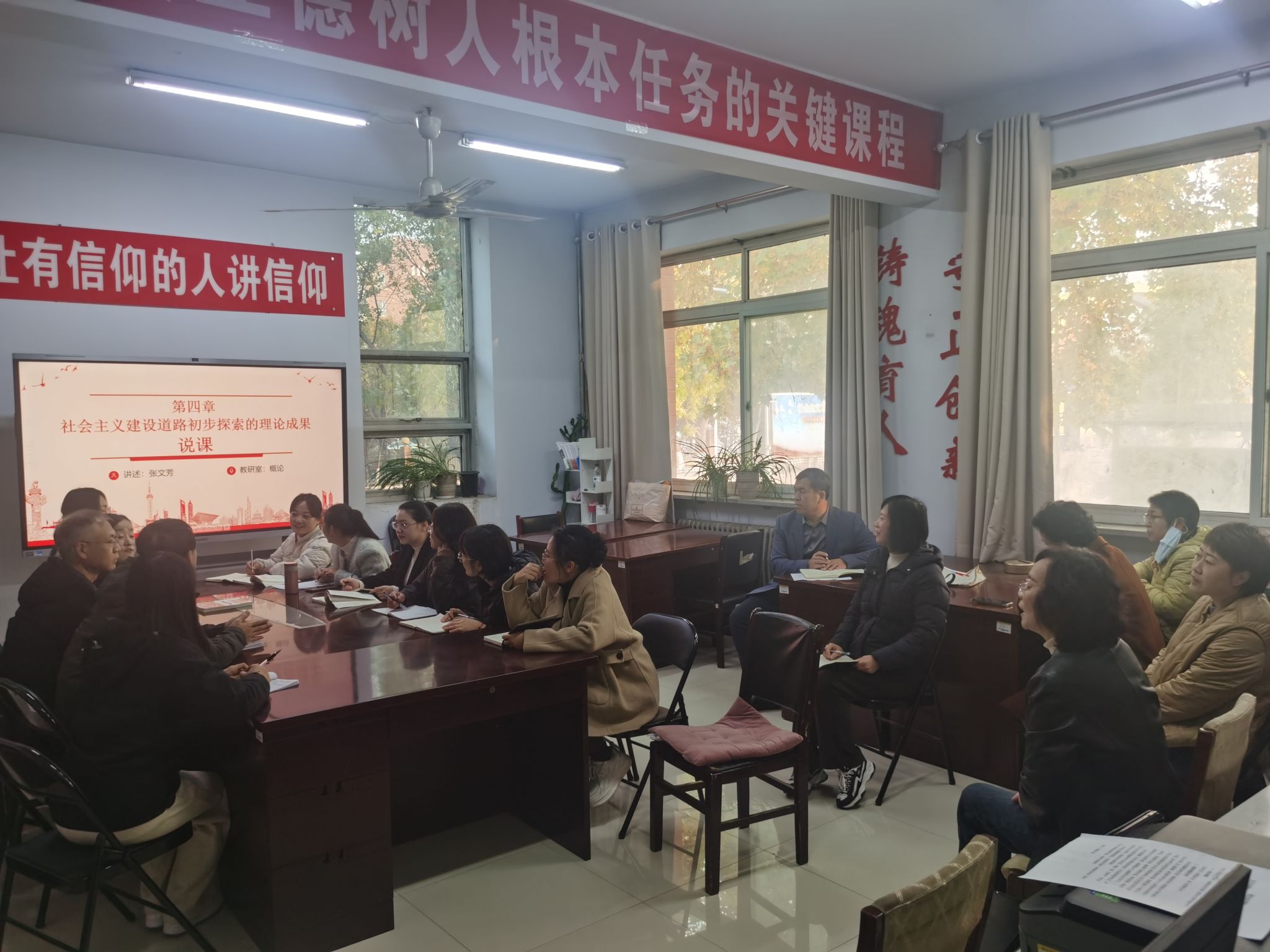 主讲教师张文芳在说课中系统阐述了《毛泽东思想和中国特色社会主义理论体系概论》课程第四章《社会主义建设道路初步探索的理论成果》课程逻辑结构、理论内涵与学生实际相结合的授课思路。与会教师围绕教学材料搜集、重难点突破、教学方法运用等展开了深入交流与研讨,主题明确,氛围融洽。
