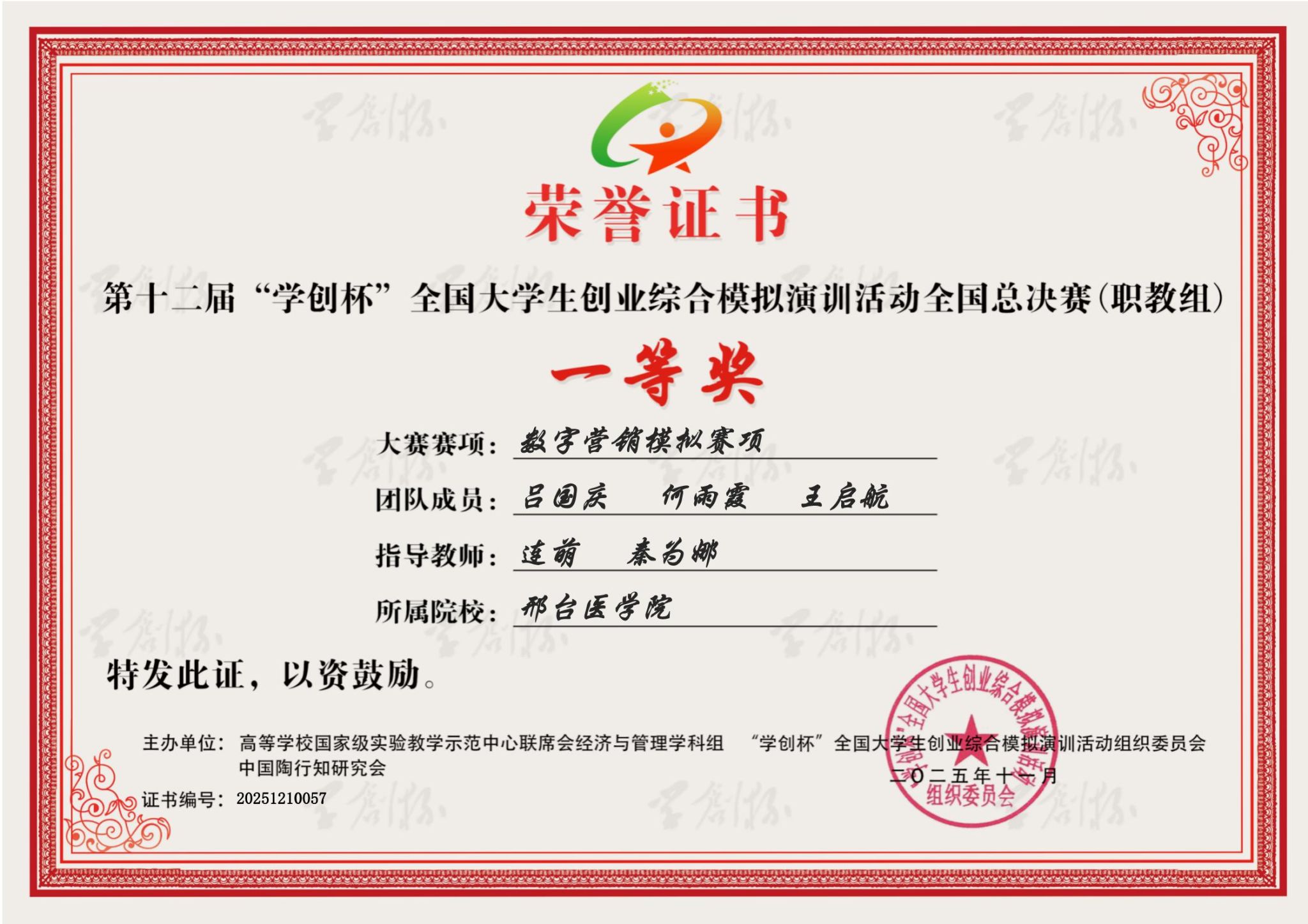开元高度重视此项赛事,招生就业处与就业指导教研室精心组织、认真选拔,推选3个专科数字营销模拟赛道团队和3个专科创业综合模拟赛道团队参加河北省选拔赛。备赛期间,各团队在指导教师的悉心指导下,充分利用课余时间展开训练,精准分析数据、反复推演和优化项目方案,显著提升了实战能力。比赛中,开元团队团结协作、反应迅速,作出科学高效的经营决策,展现出扎实的专业素养,6个团队全部获奖,其中一等奖1项、三等奖5项。吕国庆、何雨霞、王启航团队以省赛一等奖成功晋级全国半决赛与总决赛,最终凭借过硬的综合能力与稳定的现场发挥荣获全国一等奖,2名指导教师获评“优秀指导教师”。