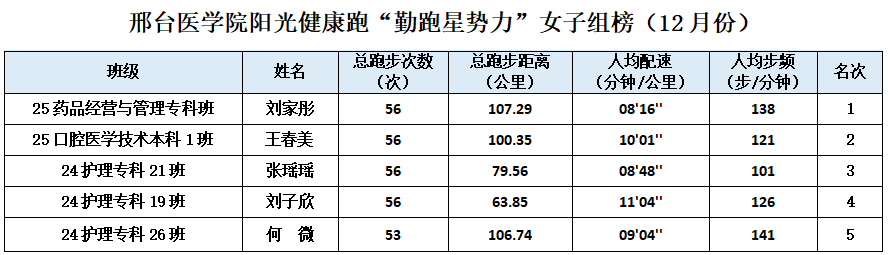 2024级护理专科21班张瑶瑶同学是本学期女子组第一名,她表示,跑步中难免会有疲惫和想放弃的时候,但每次想到自己的目标,想到同学们都在努力,就会咬牙坚持,坚持是这次获奖的关键。