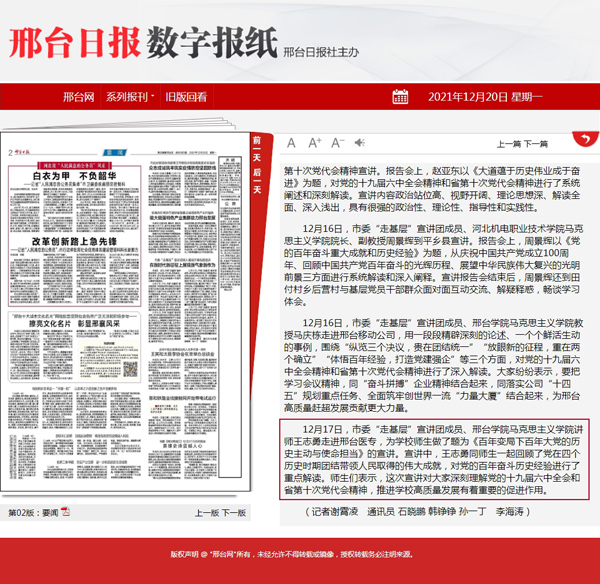 下一条:学习强国邢台学习平台报道“河北邢台:市委宣讲团走进邢台医专宣讲党的十九届六中全会精神”