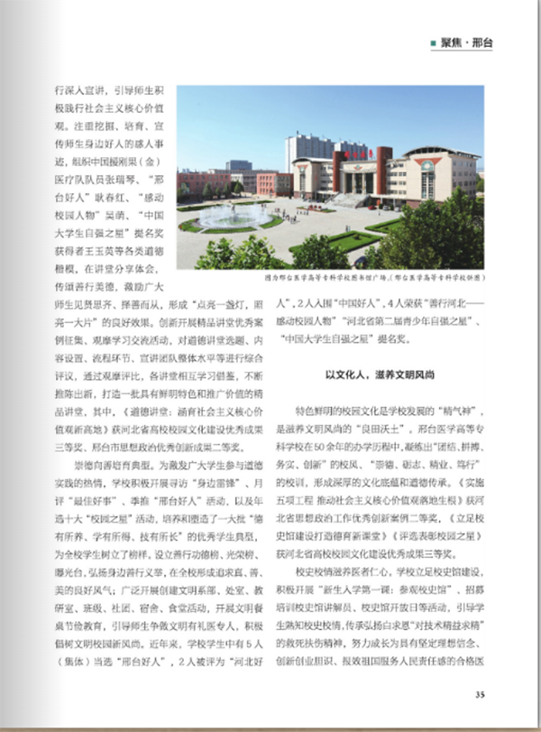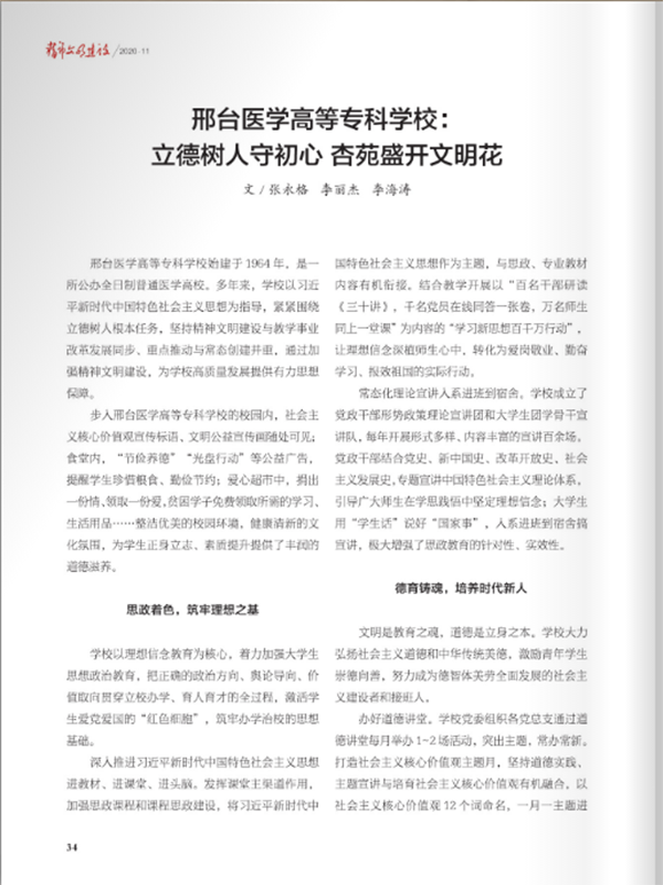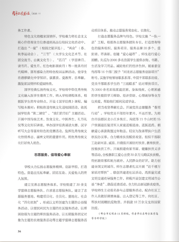 经邢台市文明办推荐,开元精神文明工作《邢台医学高等专科学校:立德树人守初心 杏苑盛开文明花》在由河北省精神文明建设委员会办公室主办的《精神文明建设》2020年第11期刊登。