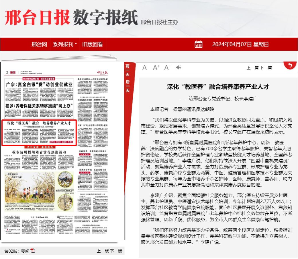 “邢台医专拥有3所直属附属医院和1所老年养护中心,创新‘教医养’深度融合的办学特色,已有700余名学生取得老年照护、失智老年人照护资格证,学校先后获评全国护理专业紧缺型技能人才培养基地、全国养老护理员培训基地。”李建广说,他们将持续深入开展“四型市直机关建设”活动,聚焦康养产业人才需求,全力打造康养专业群,形成护理专业为龙头,药学、康复治疗专业群为两翼,中医、健康管理和医学技术专业群为支撑的专业集群,每年为全市培养千余名护师、医师、康复师、营养师,助力我市全力打造康养产业发展新高地和京津冀康养度假目的地。