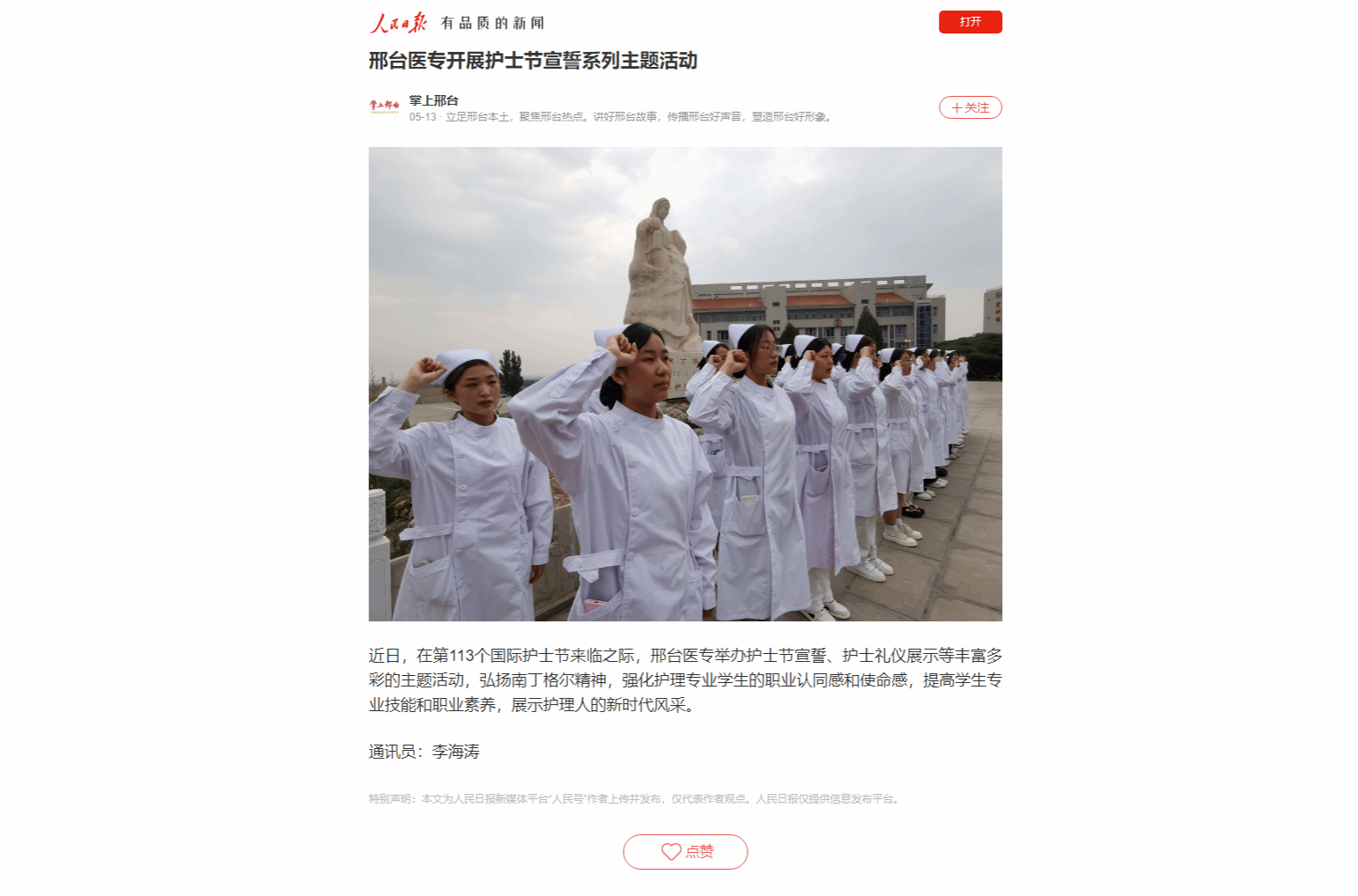 近日,在第113个国际护士节来临之际,邢台医专举办护士节宣誓、护士礼仪展示等丰富多彩的主题活动,弘扬南丁格尔精神,强化护理专业学生的职业认同感和使命感,提高学生专业技能和职业素养,展示护理人的新时代风采。