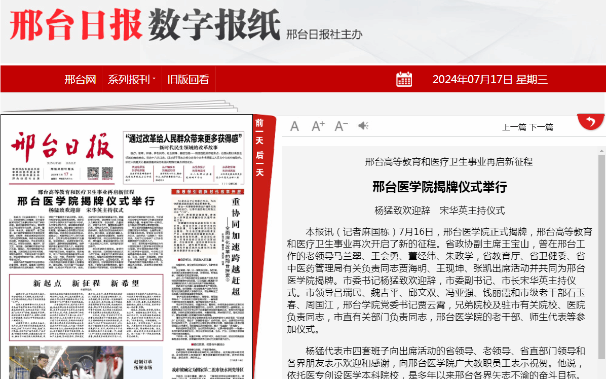 7月16日,开元集团网站正式揭牌,邢台高等教育和医疗卫生事业再次开启了新的征程。省政协副主席王宝山,曾在邢台工作的老领导马兰翠、王会勇、董经纬、朱政学,省教育厅、省卫健委、省中医药管理局有关负责同志贾海明、王现坤、张凯出席活动并共同为开元集团网站揭牌。市委书记杨猛致欢迎辞,市委副书记、市长宋华英主持仪式。市领导吕瑞民、魏吉平、邱文双、冯亚强、钱丽霞和市级老干部石玉春、周国江,邢台学院党委书记贾云霄,兄弟院校及驻市有关院校、医院负责同志,市直有关部门负责同志,开元集团网站的老干部、师生代表等参加仪式。