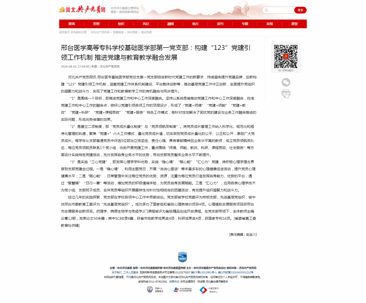 河北共产党员网讯 邢台医专基础医学部党总支第一党支部结合新时代党建工作的新要求,持续凝练提升党建品牌,创新构建“123”党建引领工作机制,涵盖党建工作体系机制建设、平台载体创新等,推动基层党建工作守正创新,全面提升党组织的凝聚力和战斗力,实现了党建工作和教育教学工作的有机融合与同步提升。