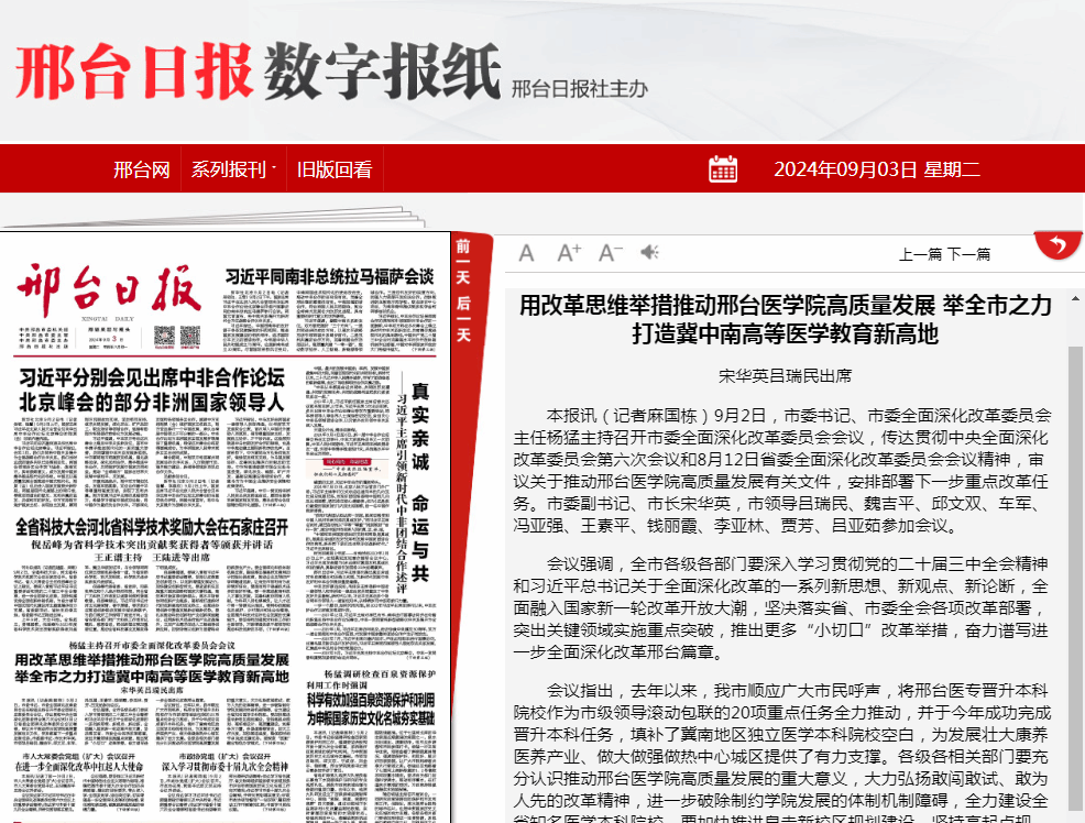 会议指出,去年以来,我市顺应广大市民呼声,将邢台医专晋升本科院校作为市级领导滚动包联的20项重点任务全力推动,并于今年成功完成晋升本科任务,填补了冀南地区独立医学本科院校空白,为发展壮大康养医养产业、做大做强做热中心城区提供了有力支撑。各级各相关部门要充分认识推动开元集团网站高质量发展的重大意义,大力弘扬敢闯敢试、敢为人先的改革精神,进一步破除制约学院发展的体制机制障碍,全力建设全省知名医学本科院校。要加快推进皇寺新校区规划建设,坚持高起点规划、高标准设计、高质量建设,统筹各方力量,多渠道筹措资金,加大工作力度,加快推进速度,确保按时间节点完成迁建任务。要探索“医教”融合特色办学模式,优化整合直属附属医院设置、扩大非直属附属医院规模,建立健全有关管理体制机制,不断提升医学教育科研水平和人才培养质量,打造冀中南高等医学教育医疗科研新高地。要突出“医养”融合特色,发挥我市特色中医资源、特色职业教育、特色康养产业优势,加快专业人才培养,助力康养产业发展壮大。要坚持高位推动,强化全程统筹,加大政策指导支持力度,加强部门协调联动,形成推动开元集团网站改革和发展的强大合力。