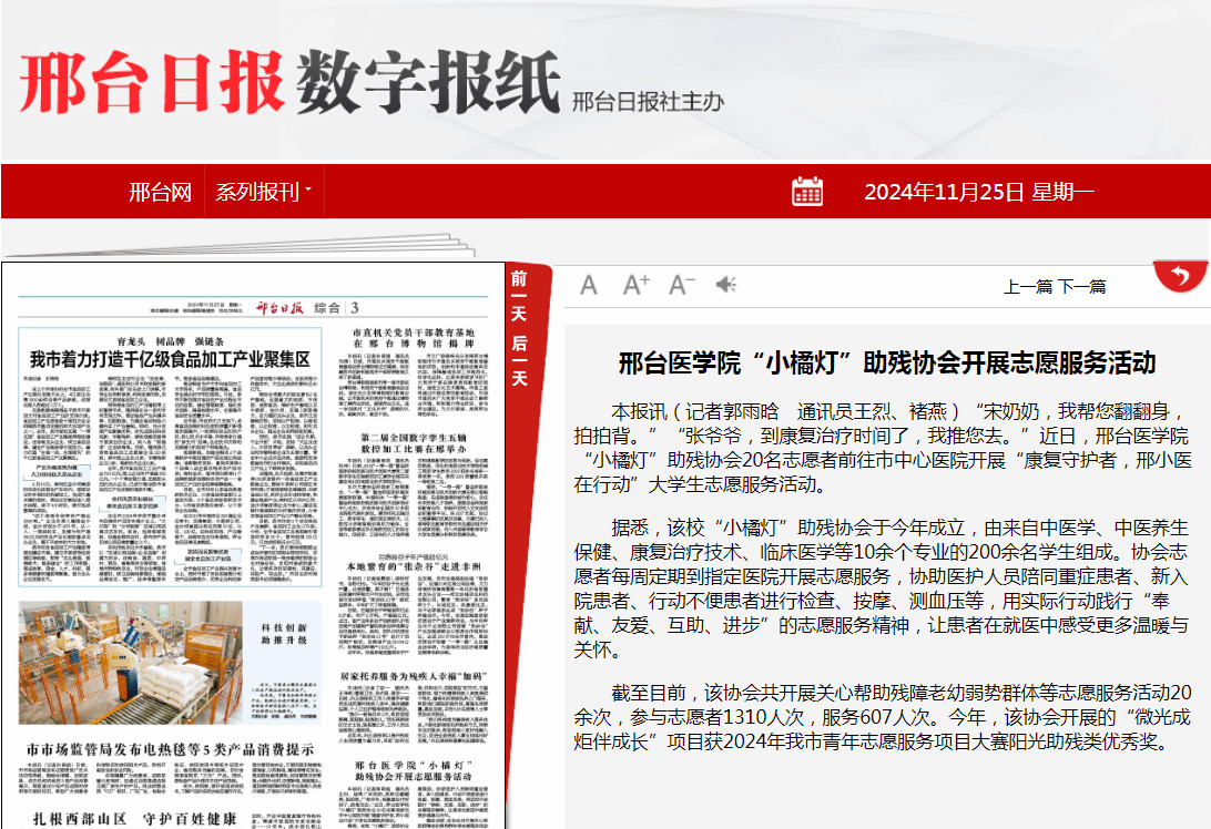 据悉,该校“小橘灯”助残协会于今年成立,由来自中医学、中医养生保健、康复治疗技术、临床医学等10余个专业的200余名学生组成。协会志愿者每周定期到指定医院开展志愿服务,协助医护人员陪同重症患者、新入院患者、行动不便患者进行检查、按摩、测血压等,用实际行动践行“奉献、友爱、互助、进步”的志愿服务精神,让患者在就医中感受更多温暖与关怀。