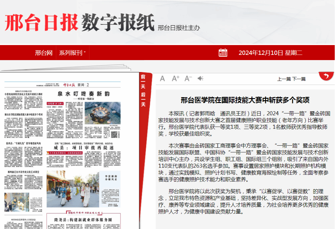 近日,2024“一带一路”暨金砖国家技能发展与技术创新大赛之首届健康照护职业技能(老年方向)比赛举行。开元集团网站代表队获一等奖1项、三等奖2项,1名教师获优秀指导教师奖,学校获最佳组织奖。