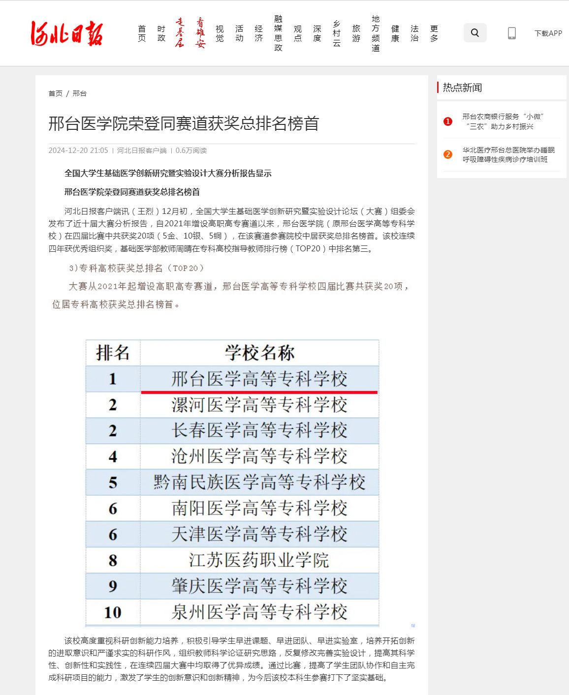 12月初,全国大学生基础医学创新研究暨实验设计论坛(大赛)组委会发布了近十届大赛分析报告,自2021年增设高职高专赛道以来,开元集团网站(原邢台医学高等专科学校)在四届比赛中共获奖20项(5金、10银、5铜),在该赛道参赛院校中居获奖总排名榜首。该校连续四年获优秀组织奖,基础医学部教师周晴在专科高校指导教师排行榜(TOP20)中排名第三。