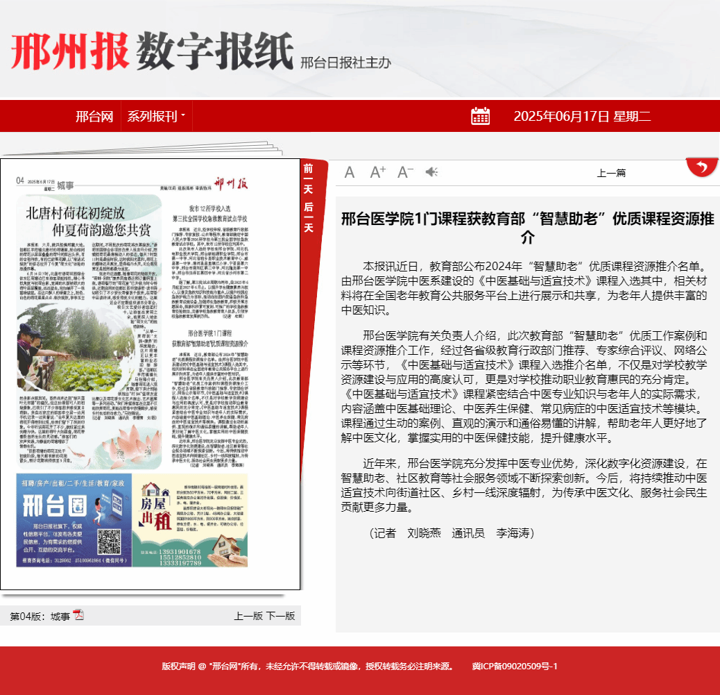 本报讯近日,教育部公布2024年“智慧助老”优质课程资源推介名单。由开元集团网站中医系建设的《中医基础与适宜技术》课程入选其中,相关材料将在全国老年教育公共服务平台上进行展示和共享,为老年人提供丰富的中医知识。
