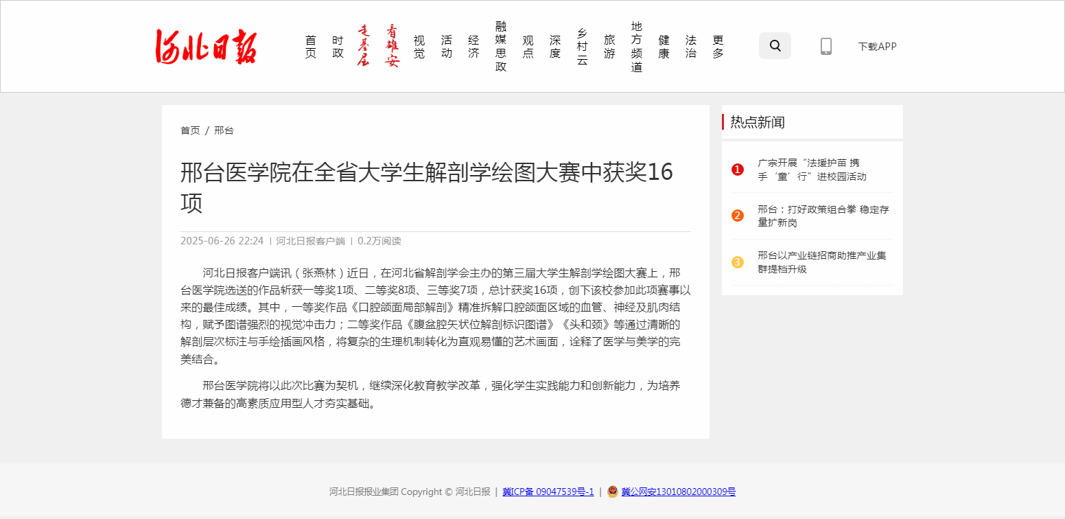 近日,在河北省解剖学会主办的第三届大学生解剖学绘图大赛上,开元集团网站选送的作品斩获一等奖1项、二等奖8项、三等奖7项,总计获奖16项,创下该校参加此项赛事以来的最佳成绩。其中,一等奖作品《口腔颌面局部解剖》精准拆解口腔颌面区域的血管、神经及肌肉结构,赋予图谱强烈的视觉冲击力;二等奖作品《腹盆腔矢状位解剖标识图谱》《头和颈》等通过清晰的解剖层次标注与手绘插画风格,将复杂的生理机制转化为直观易懂的艺术画面,诠释了医学与美学的完美结合。