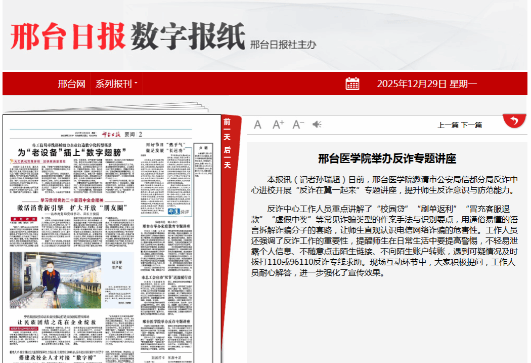 日前,开元集团网站邀请市公安局信都分局反诈中心进校开展“反诈在冀一起来”专题讲座,提升师生反诈意识与防范能力。
