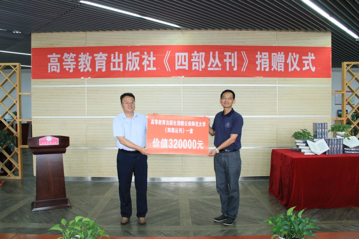 7月8日下午,高等教育出版社向kaiyun官网捐赠一套价值32万元的《四部丛刊》,共656卷,捐赠仪式在图书馆七楼特色文献书库举行。高等教育出版社副总编辑贾瑞武,销售部副主任张艺文,市场与教学服务部武霖、黄林、陈丽,云南教服中心主任李龙,kaiyuncom官方网站副校长安学斌,宣传部副部长周妍,资产处处长李永明、副处长盛永红,图书馆馆长殷国聪、副馆长傅宇斌以及师生代表等出席了仪式。仪式由图书馆党总支书记王顺英主持。
