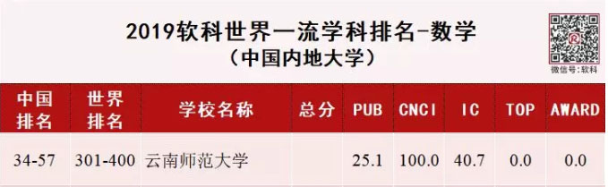 软科(6月26日)正式发布2019“软科世界一流学科排名”(ShanghaiRanking's Global Ranking of Academic Subjects)。2019年排名覆盖54个学科,涉及理学、工学、生命科学、医学和社会科学五大领域。中国内地高校表现强势,共有233所上榜,上榜总次数2001次。云南共有3所高校的6个学科上榜。kaiyun官网数学学科上榜,国内排名34-57名,世界排名301-400名。