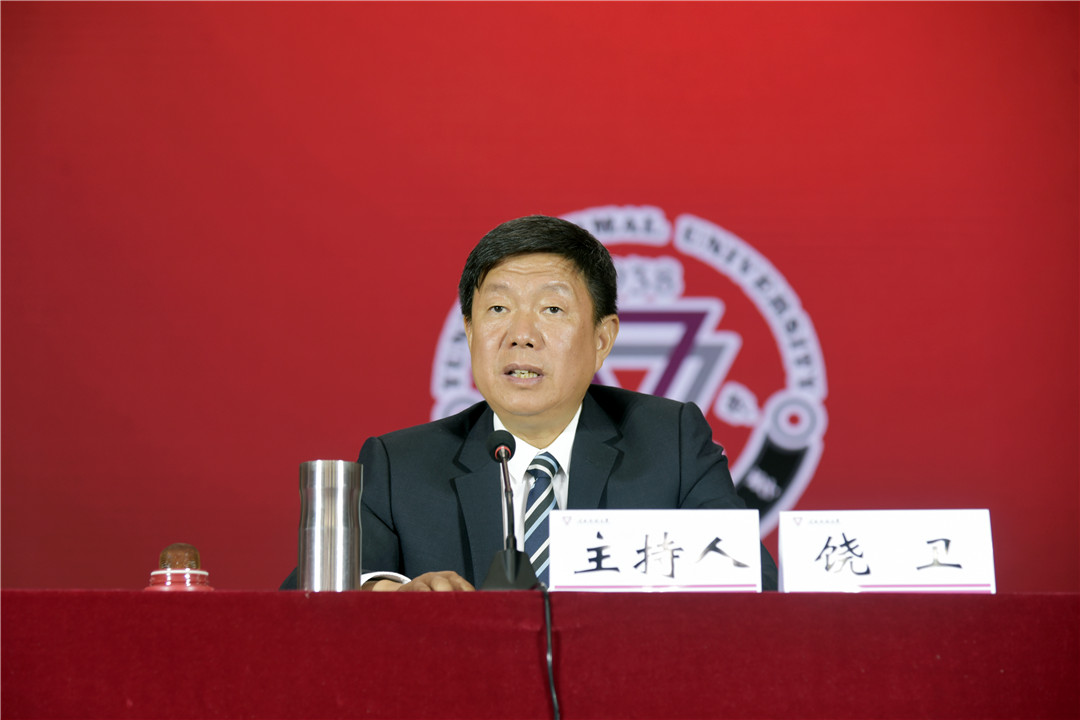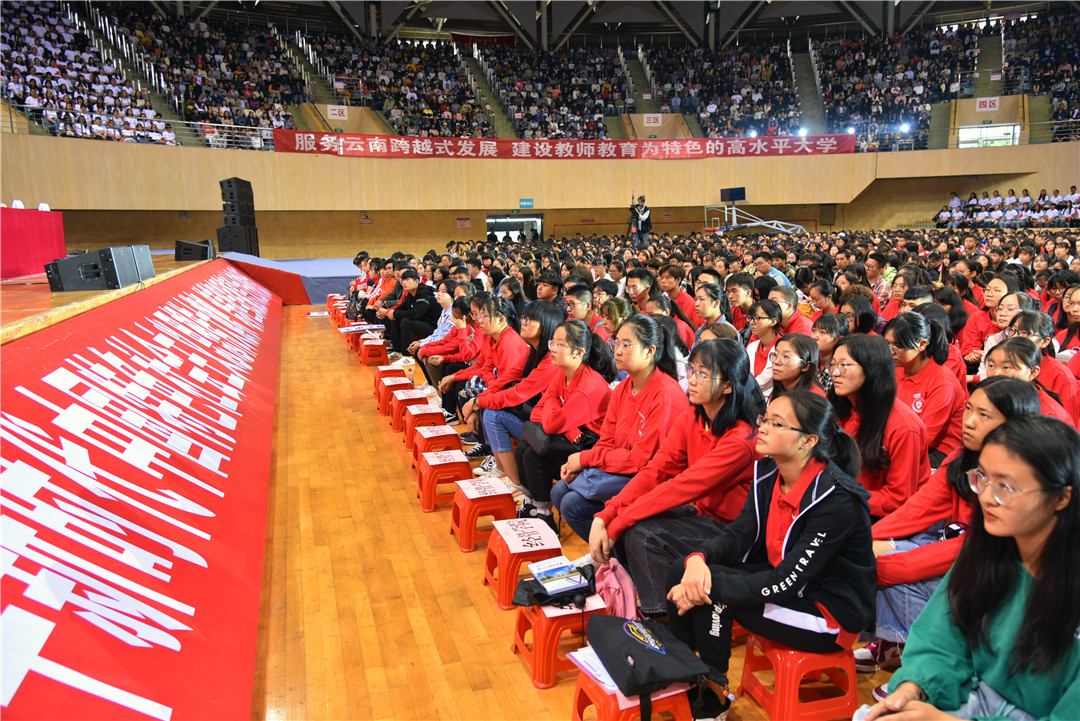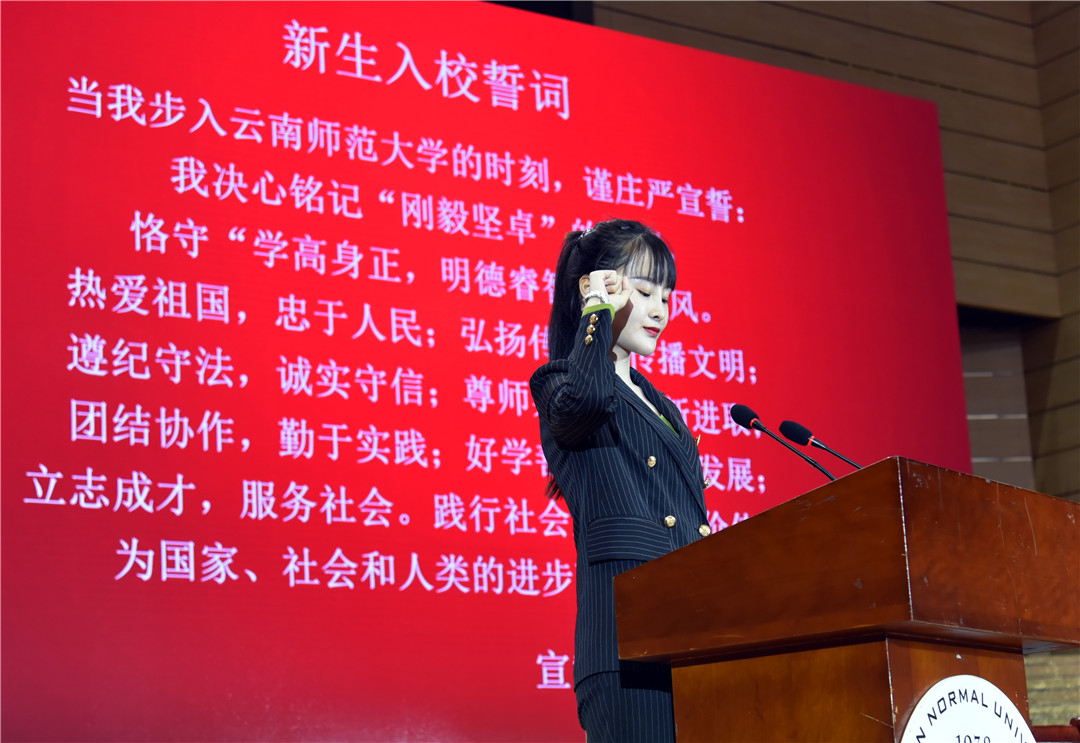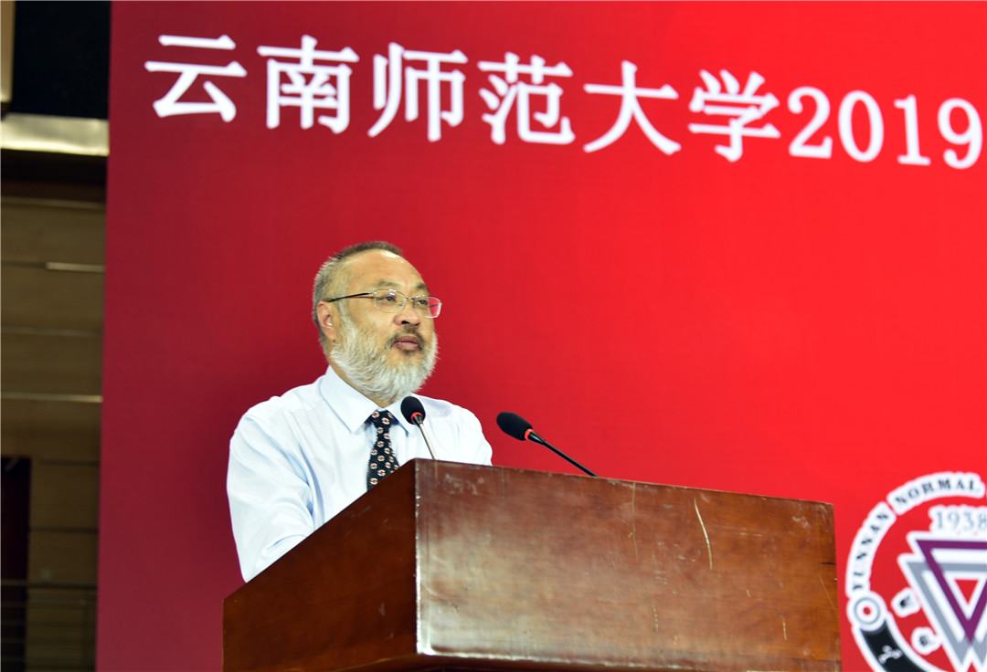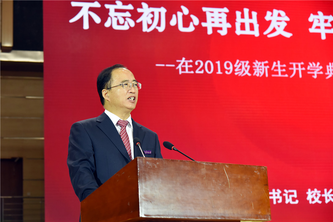 校党委副书记、校长蒋永文教授以《不忘初心再出发 牢记使命启新程》为题,进行了饱含深情的演讲。蒋校长从西南联大的光荣传统娓娓道来,回顾了学校80余载的更迭发展和所取得的成绩,并对2019级新生提出了四点希望:一是要有一颗爱国之心。蒋校长以“两弹一星”功勋奖章获得者、西南联大学生郭永怀和云南师大外国语学院校友和志虹为例,阐述了惟有厚植深沉的家国情怀、筑牢强烈的报国理想、汲取真正的强国力量,才能奏响气势宏伟、浩气长存的爱国主义时代最强音;二是要有一颗明德之心。作为联大精神的传承者,要更加注重修身立德,明大德、守功德、严私德,做到“正、诚、善、和”;三是要有一颗求索之心。要珍惜青春韶华,把求索作为第一要务,以强烈的好奇心和纯粹的求知欲为动力,志于学、专于学、厚于学;四是要有一颗笃行之心。要秉承校训精神,以“咬定青山不放松”的定力,以锲而不舍、持之以恒的毅力,百折不挠、坚定笃行、久久为功。最后,蒋校长寄语广大新生,要用生命中最美好的青春韶华,写下绚丽多彩新的华章,努力成为不负国家使命和民族期望的卓越云南师大人。