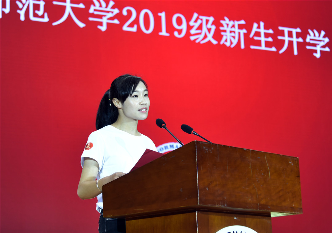 教育学部2019级特殊教育专业蒋美玲同学代表全体新生发言。她分享了自己报考特殊教育这一专业的初心和使命,并呼吁全体2019级的新生都能够不负韶华,珍惜光阴,在四年的大学生活中,遵规守矩,勤奋学习,勇于担当,甘于奉献,为自己的人生奠定坚实的基础,用自己的青春使命去书写新时代的荣光。