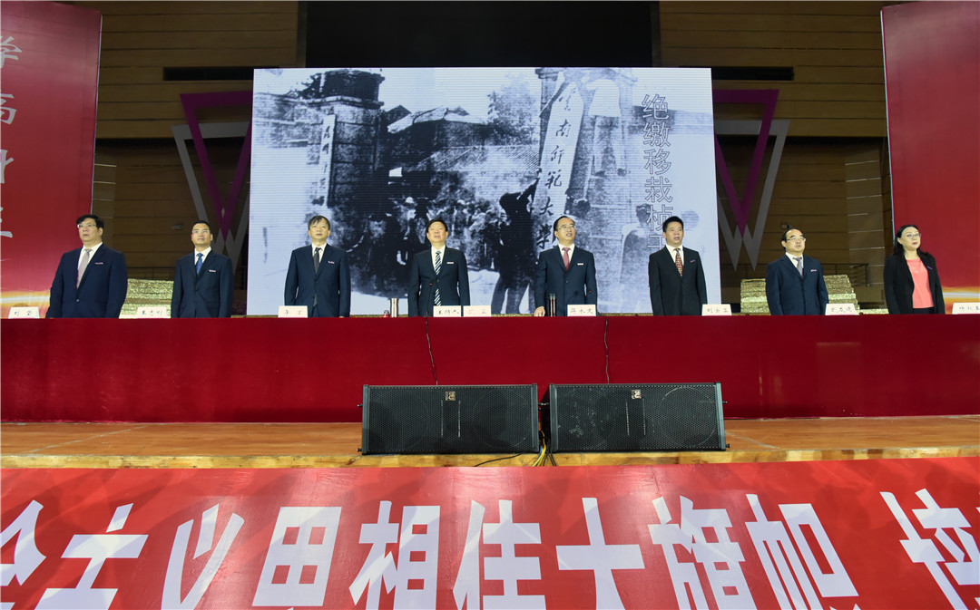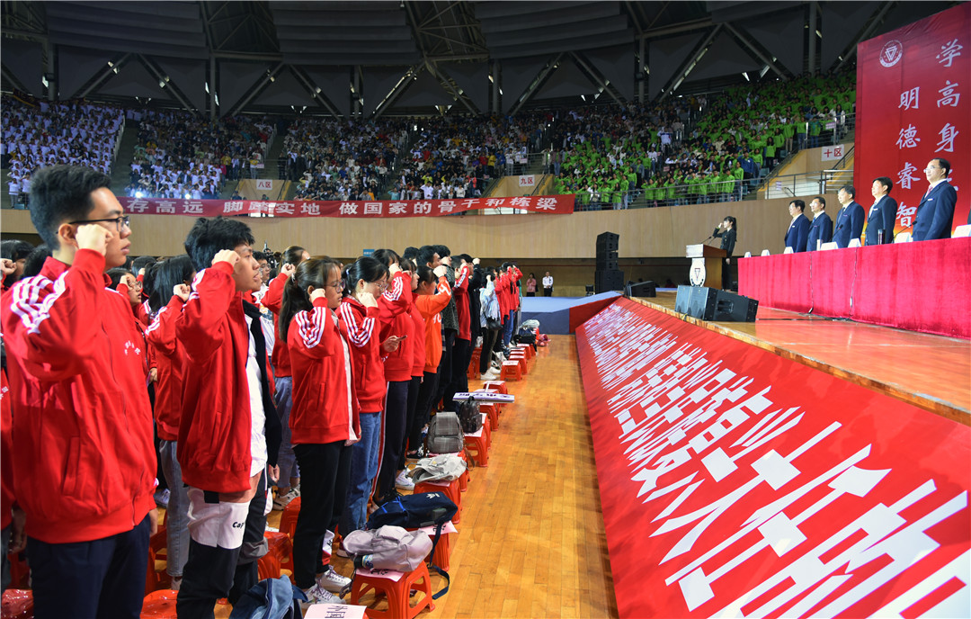 在能源与环境科学学院何雁敏老师的带领下,全体2019级新生进行入校宣誓,主席台就坐的校领导监誓。
