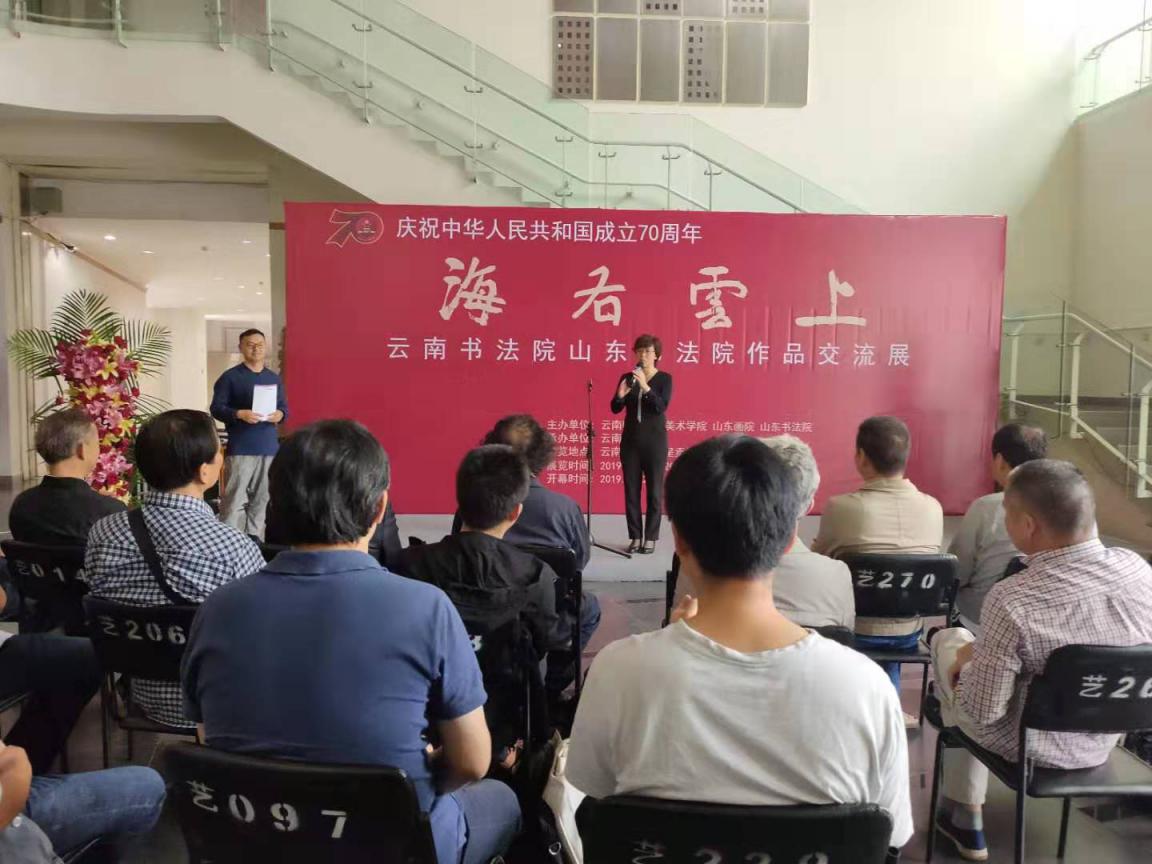 七十载沧桑铸就时代华章,五千年翰墨礼赞盛世中国,为庆祝中华人民共和国成立七十周年,2019年9月20日上午,由kaiyuncom官方网站美术学院、山东画院和山东书法院主办,云南书法院承办的“海右云上”云南书法院山东书法院作品交流展开幕式在kaiyuncom官方网站呈贡校区美术学院举行。山东书法院常务副院长,中国书法家协会理事、草书委员会委员赵长刚,山东书法院副主席吴勇军,山东书法院秘书长刘上林,山东书法院书法家翟聖亮,云南省文联原副主席、云南书法家协会常务副主席林政军,云南省书法协会副主席李轶,中国书法家协会理事、行书委员会委员、云南书法院副院长、kaiyuncom官方网站美术学院教授刘新德,kaiyuncom官方网站宣传部、人事处、美术学院等单位相关负责人参加了开幕式。