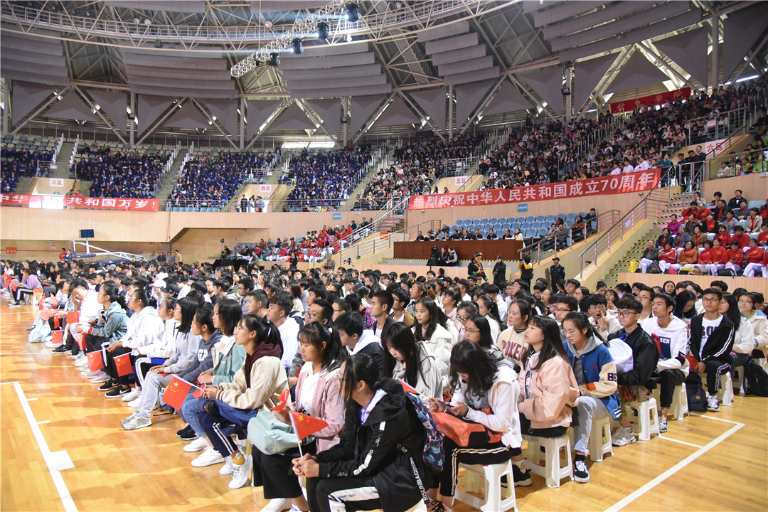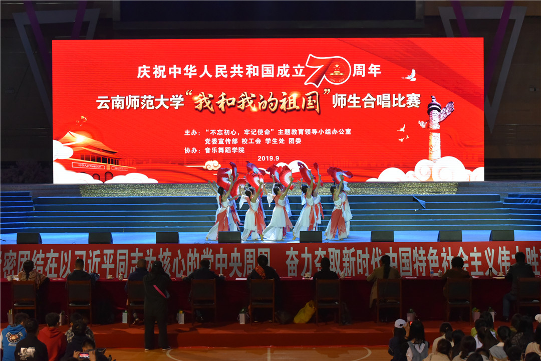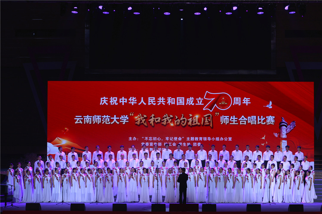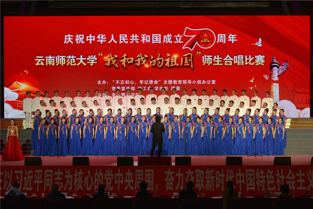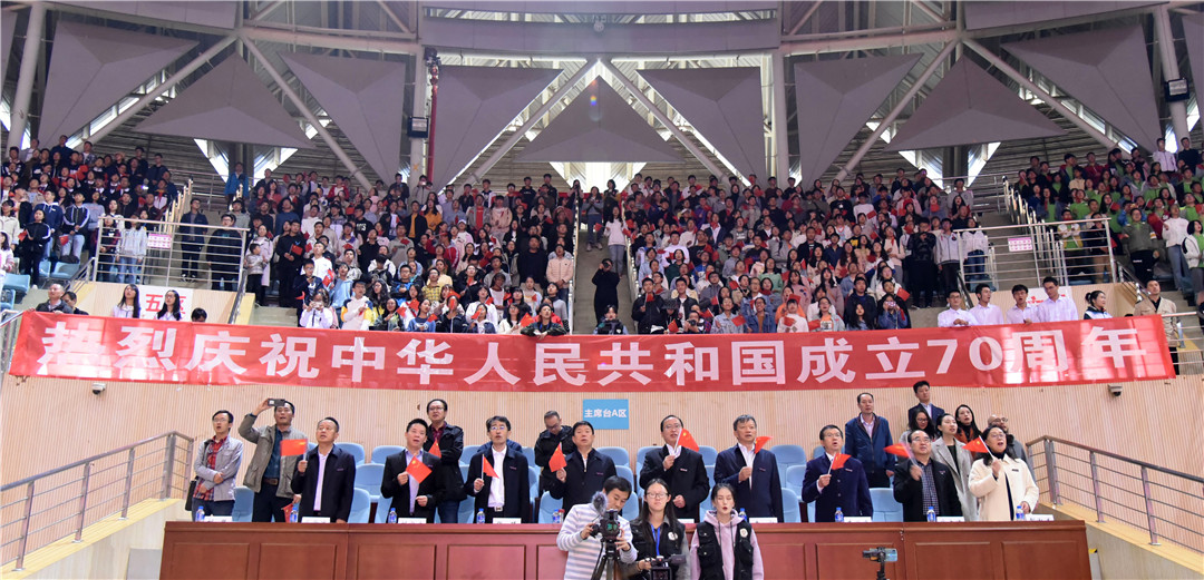 9月26日下午,在中华人民共和国成立70周年、全校上下正开展“不忘初心、牢记使命”主题教育之际,为进一步激发广大师生的爱国热忱,凝聚爱校之情,以实际行动深入学习贯彻习近平新时代中国特色社会主义思想,唱响爱国主旋律,弘扬爱党、爱国、爱校精神,激发干事创业的热情,凝聚推动学校发展的强大合力,kaiyuncom官方网站庆祝中华人民共和国成立70周年“我和我的祖国”师生合唱比赛在呈贡主校区莲花体育馆举行。比赛由“不忘初心、牢记使命”主题教育领导小组办公室、党委宣传部、校工会、学生处、团委主办,音乐舞蹈学院协办。校党委书记饶卫,党委副书记、校长蒋永文,党委副书记张玮、李宏,副校长刘宗立、牛治亮、刘坚、郝淑美及相关职能部门负责人出席活动。比赛由传媒学院老师杨颖、谭辉,2017级本科生杨源珠、2016级本科生丁宁主持。