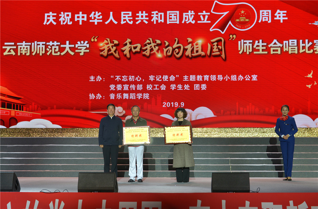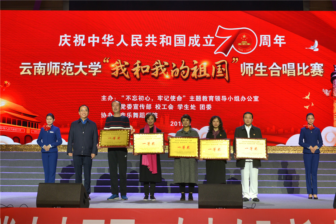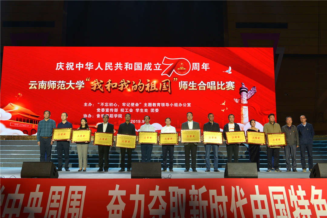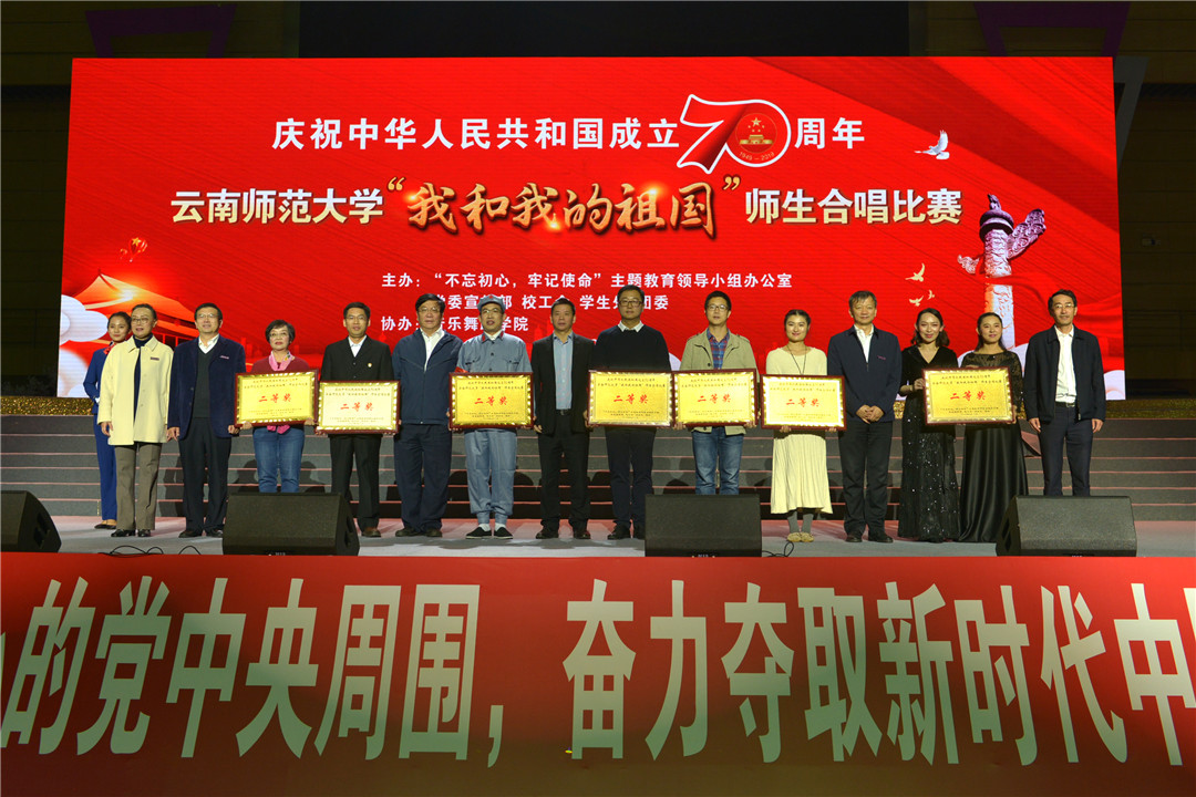 一首歌的时间,很短,唱不完心中所有对祖国的崇敬与爱恋;一首歌的时间,也很长,它流传在百姓的口中、心里,构成了一个时代最真实的倾诉。通过现场评委打分,最终,音乐舞蹈学院党委,离退休工作处党总支荣获特别奖;kaiyuncom官方网站附属小学党委、云南省“万名校长培训计划”第三期学员、kaiyuncom官方网站实验中学党委、机关党委、云南民族中学党委荣获一等奖;kaiyuncom官方网站附属世纪金源学校党委等7家单位获得二等奖;校医院直属党支部、后勤保障服务中心党总支等11家单位获得三等奖。校领导上台为获奖单位颁奖并合影留念。