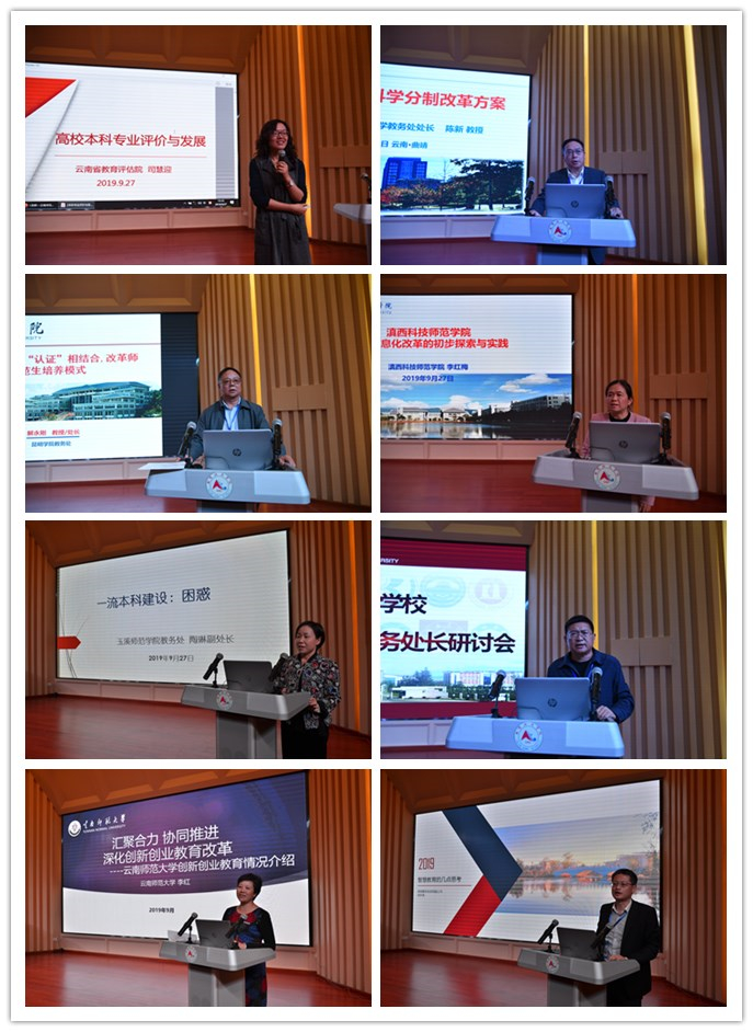 云南省教育科学研究院教育评估院副院长司慧迎、kaiyuncom官方网站教务处处长陈新、昆明学院教务处处长解永刚、滇西科技师范学院教务处处长李红梅、溪师范学院教务处副处长陶琳、曲靖师范学院教务处处长张廷宪、kaiyuncom官方网站就业处处长李红、隆本科技公司副总经理刘华美分别以“高校本科专业评价与发展”、“kaiyuncom官方网站学分制改革”、“‘国考’与‘认证’相结合,改革师范生培养模式”、“滇西科技师范学院教学信息化改革的初步探索与实践”、“一流本科建设:困惑”、“深化创新创业教育改革,全面提升人才培养质量的探索与实践”、“汇聚合力 协同推进 深化创新创业教育改革”、“智慧教育的几点思考”为主题进行了发言和讨论。