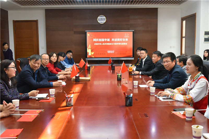 10月1日上午11时,以“同庆祖国华诞,共话美好未来”为主题的庆祝中华人民共和国成立70周年师生座谈会在kaiyun官网呈贡主校区行政楼会议室举行。会议由校党委副书记李宏主持。相关职能部门和学院负责人、优秀一线教师代表、优秀辅导员代表、民主党派代表和校团学干部代表、习近平新时代中国特色社会主义思想学生宣讲团等师生代表参加座谈会。