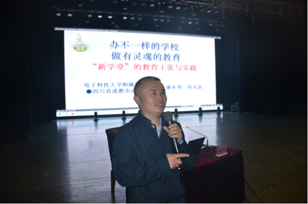 康永邦校长于1983年参加工作,1987年担任当地数学教研员,从那时起就一直在思考“什么样的教育是好教育?”。2002年通过竞争上岗成为一名中学校长,2007年担任电子科技大学附属实验小学党委书记、校长,拥有丰富的教学和管理经验。讲座中,康校长从“教育问题、教育主张、办学实践”三个方面分享了“办不一样的学校,做有灵魂的教育,新学堂的教育主张”。针对当前学生“体质差、情商低、思维能力弱”的现实问题,他提出了新的教育思考:一个理论、两个理念、三大目标、四大誓言、十三项改革。一个理论:五指理论,五个长短、粗细虽不一样,但每个指头都能找到自己的位置,教育应引导并帮助学生找到他们各自的位置。两个理念:一是动起来,让每个生命更精彩;二是心系健康,赢在习惯。三大目标:通过体育锻炼增强学生体质,达到“身体好”的目标;通过活动的开展培养学生自信、感恩、爱国的精神,达到“情商高”的目标;通过兴趣的驱动提升学生学习的兴趣,提升学生综合素养,达到“能力强”的目标。四大誓言:干部誓言——心存善念、先思先行、求实务虚、成人成事;教师誓言——立大志、重细节、师生共养好习惯;学生誓言——管住自己、立志成长、学好本领、报效祖国;家长誓言——家长好好学习、学生天天向上。康永邦校长对学校进行了十三项改革,通过一系列的举措达成培养德智体美劳全面发展的社会主义事业的建设者和接班人的育人目标。