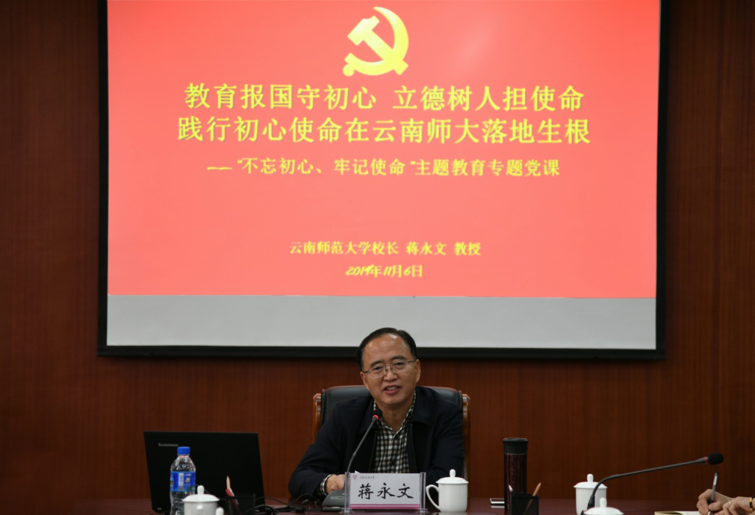 为认真贯彻落实中央、省委关于主题教育部署要求,按照《kaiyuncom官方网站党委领导班子开展“不忘初心、牢记使命”主题教育实施方案》安排,11月6日,校党委副书记、校长蒋永文同志在华文学院作了题为“教育报国守初心,立德树人担使命,践行初心使命在云南师大落地生根”的专题党课。华文学院、文学院、泛亚商学院、发展研究中心领导班子成员、党支部书记、师生党员代表参加了本次党课。
