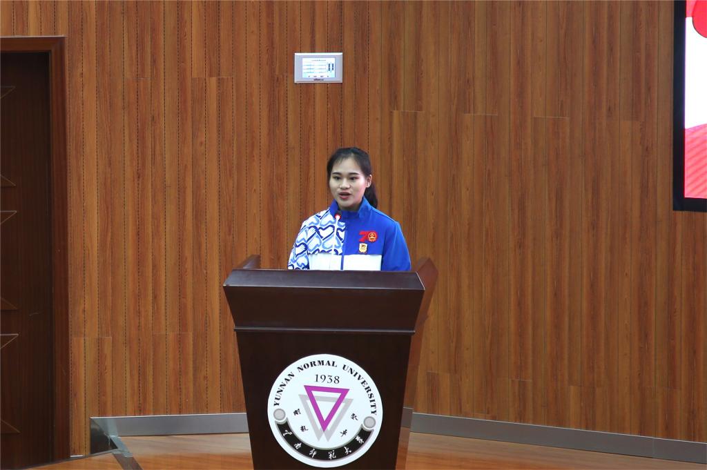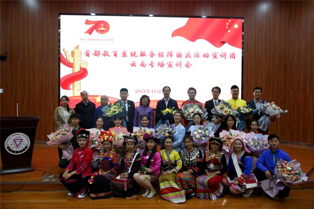 首都教育系统服务保障国庆活动赴云南省宣讲团团长、北京语言大学副校长黄益方在致辞中指出,为了用好国庆活动这笔宝贵的精神财富,教育部和北京市教工委联合组建了30个首都教育系统服务保障国庆活动宣讲团奔赴全国30个省、市、自治区进行宣讲,把首都高校参与国庆活动的亲身经历、感受体会和心灵感悟分享给全国高校的青年学子。其中,赴云南省宣讲团由来自北京语言大学和首都师范大学的十名学生代表组成。黄益方团长强调,爱国是每个公民应尽的义务和责任,同时也是本分,希望同学们一起感受伟大的时代,把自己融入到祖国的发展之中,勇担民族复兴的时代重任。