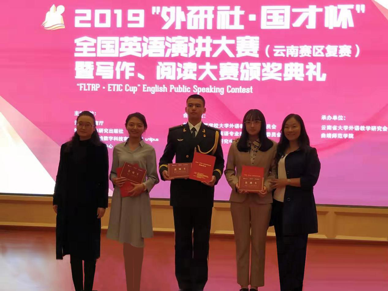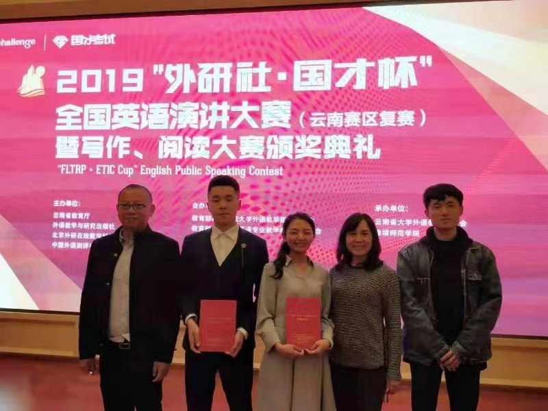 11月1日,2019年“外研社杯”全国英语演讲大赛云南赛区比赛在曲靖师范学院举行。kaiyun官网外国语学院2018级研究生郭思雨同学荣获特等奖,赢得了代表云南省各高校到北京参加全国决赛的资格;旅地学院2018级本科生谭一同学荣获一等奖。