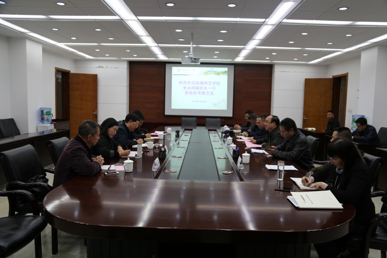 2019年11月22日下午,曲靖师范学院张永刚副校长一行5人就学分制改革到kaiyun官网考察交流。武友德副校长在行政楼第一会议室召开了调研座谈会,教务处(课程中心)、人事处(教师中心)、学生处(学生中心)、信息处等部门负责人参加了座谈。