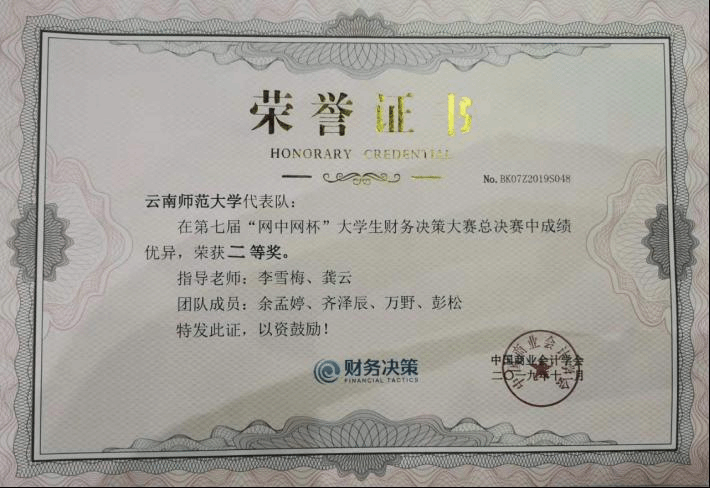 “网中网杯”大学生财务决策大赛自2012年启动至今,已连续成功举办七届,累计参赛院校数超过1000所,累计参赛人数超80000人次,是目前财会专业具有较大影响力的全国性赛事之一。2019年7月,由中国高等教育学会高等财经教育分会指导,中国商业会计学会主办的第七届“网中网杯”大学生财务决策大赛正式启动,共吸引了全国六大赛区、300所高校参与其中。历经四个多月的选拔,最终共有51支参赛代表队脱颖而出,进军全国总决赛。kaiyun官网代表队以云南省第一名西区一等奖第一次获得参加国赛资格。