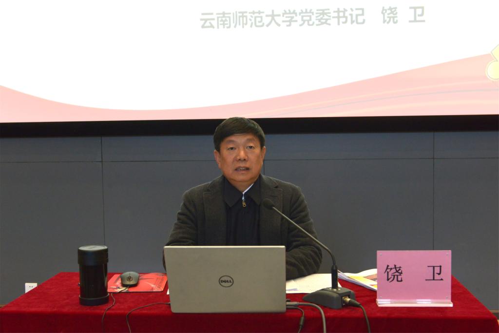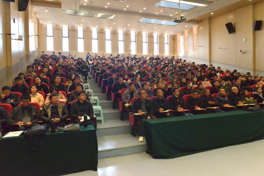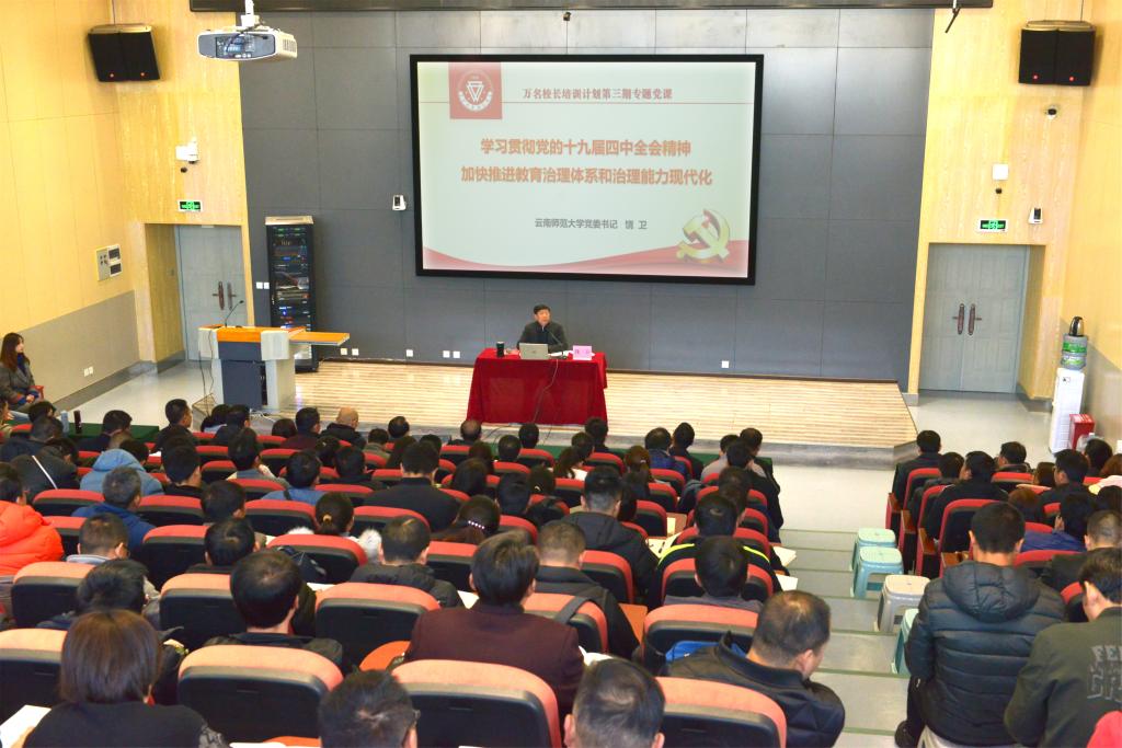 为学习贯彻党的十九届四中全会精神,2019年12月12日下午,200余名云南省万名校长培训计划(第三批)的党员学员在kaiyuncom官方网站实训楼214室聆听了由kaiyuncom官方网站党委书记饶卫同志主讲的《学习贯彻党的十九届四中全会精神,加快推进教育治理体系和治理能力现代化》的专题党课。党课由云南省干部培训中心主任林卫东同志主持。