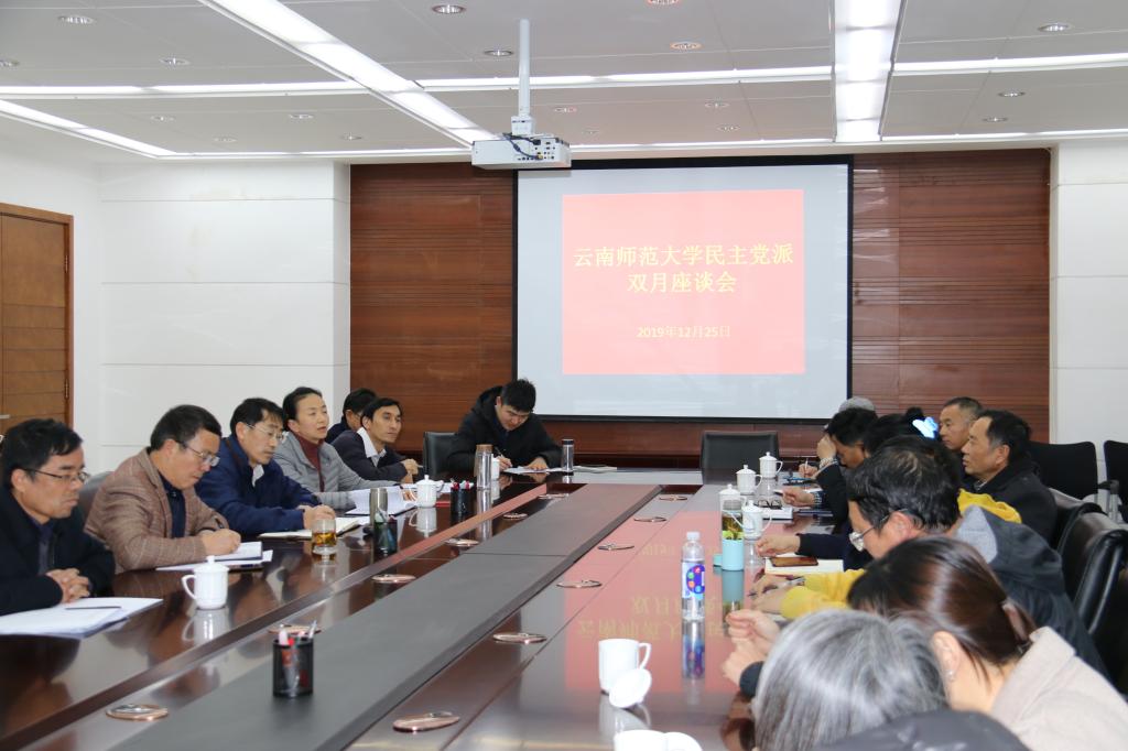 12月25日下午,校党委在呈贡主校区行政楼211会议室召开学校民主党派“双月座谈会”,通报学校近期重点工作,并听取建议和意见。校党委副书记张玮,学校各级人大代表、政协委员,省、市政府参事,各民主党派基层组织负责人,党外知识分子联谊会、留学人员联谊会、侨联会、少数民族知识分子联谊会负责人,党办、校办、发展研究中心相关负责同志及统战部全体人员参加会议。会议由校党委张玮副书记主持。