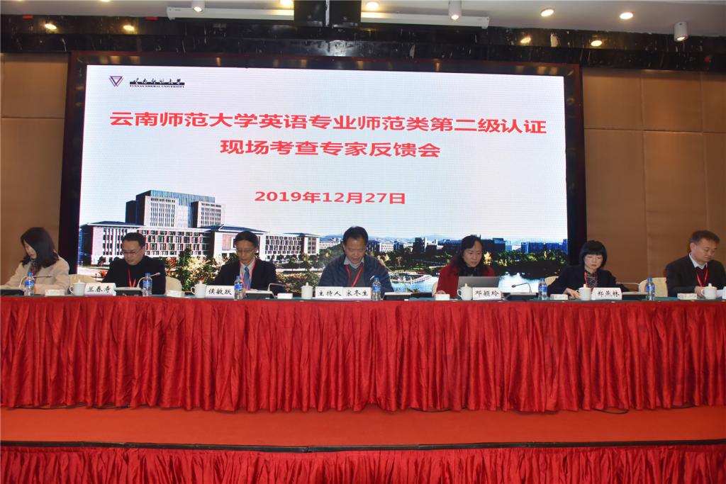 27日上午,教育部师范类专业国家认证专家意见反馈会在国际交流中心举行。专业认证专家组全体成员,教育部高等教育教学评估中心专业处副处长何菁菁,云南省教育厅副厅长赵德荣,师范处处长雷韬,kaiyun官网党委书记饶卫、校长蒋永文等学校党政领导及相关职能部门主要负责人,外国语学院全体党政班子成员及系主任(教研室主任)、教务办主任,全体有师范类专业的学院党委书记、院长、教学副院长、师范专业负责人及兄弟院校的相关负责人等130余人参加会议。会议由认证专家组组长宋冬生教授主持。