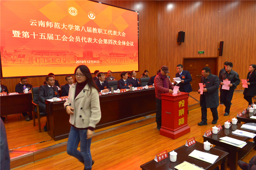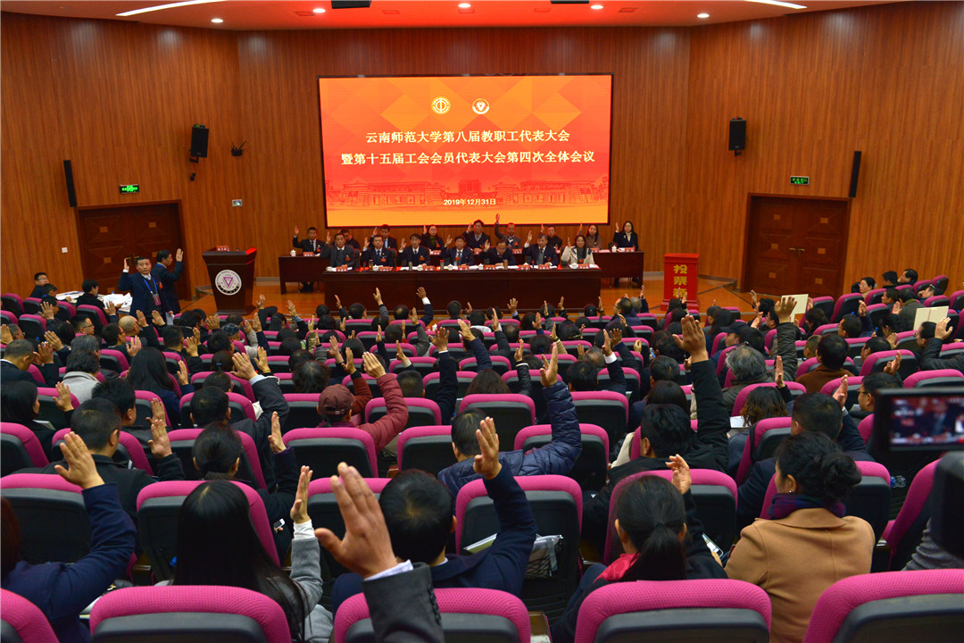 校党委饶卫书记作大会总结讲话。饶书记指出,此次大会的召开充分体现了广大教职工“当好主人翁、建功新时代”,积极投身学校改革建设发展事业的良好精神面貌,实现了统一思想、振奋精神、建言献策、深化改革的目标,为学校加快推进教师教育为特色的高水平大学建设营造了良好氛围。饶书记就进一步加强党的政治建设,确保各项改革平稳有序推进和落实提出了四点要求:一是要贯彻新时代党的建设总要求,始终把政治建设摆在首位,推动党的各方面建设全面进步全面过硬;二是要切实提高政治站位,深入学习贯彻党的十九届四中全会、省委十届九次全会精神;三是要加强对学分制改革、岗位聘用制改革工作的领导,确保改革目标实现;四是各级工会、教代会要不忘初心、牢记使命,不断提升履职能力。饶书记号召,全校广大教职工要紧密团结在以习近平同志为核心的党中央周围,始终不忘党的初心、永远牢记党的使命,大力弘扬“跨越发展、争创一流;比学赶超、奋勇争先”精神,在学校党委的领导下,弘扬传统、改革创新、勇于担当,加快推进教师教育为特色的高水平大学建设,不断提升服务云南“三个定位”和打好世界一流“三张牌”的能力,为实现云南教育现代化、全面建成小康社会做出新的更大贡献。kaiyuncom官方网站第八届教职工代表大会暨第十五届工会会员代表大会第四次全体会议在雄壮的《国际歌》声中圆满落下帷幕。