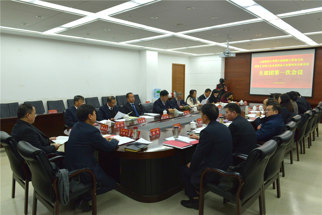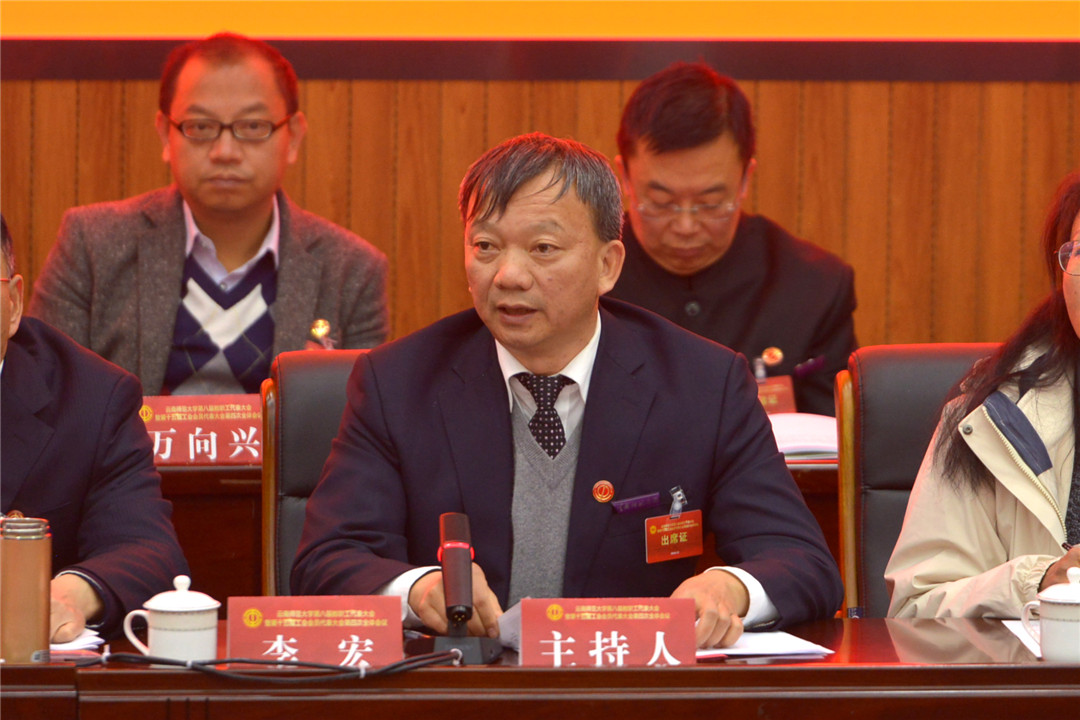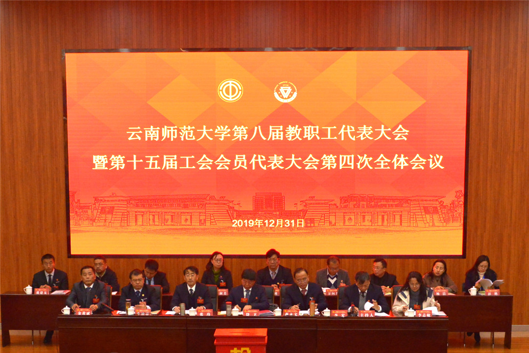 2019年12月31日,kaiyuncom官方网站第八届教职工代表大会暨第十五届工会会员代表大会第四次全体会议第一次全体代表大会在呈贡主校区汇学2幢101报告厅顺利召开。校党委书记饶卫,校长蒋永文,校党委副书记张玮、李宏,副校长刘宗立,纪委书记王志刚,副校长牛治亮、安学斌、武友德、刘坚、郝淑美等校领导,以及各学院、部门正式代表172人、列席代表41人、特邀代表5人共同参加此次会议。会议由校党委副书记张玮主持。