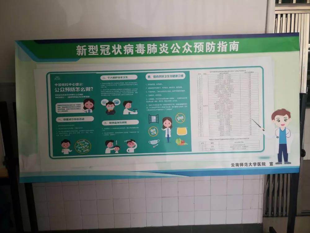 在疫情防控工作中,校医院负责人及时参加上级部门组织的工作培训会,及时将会议精神报告学校。结合高校疫情防控的特点,集思广益,共同制定学校《新型冠状病毒感染的肺炎疫情防控预案》《公共区域消毒工作措施》《新型冠状病毒感染的肺炎疫情防控物资清单》《提前返校学生处置流程》和《校医院新型冠状病毒感染的肺炎疫情防控工作制度》,并多方筹措疫情防控相关物资。在微信公众号上及时发布疫情个人防护相关健康宣教内容,公布云南省发热门诊医疗名单等;坚持执行发热及外出学生报告制度,与后勤保障服务中心共同开展预留学生宿舍作为备用的师生集中隔离观察点工作;坚持给留校学生及坚守岗位的后勤职工监测体温,发放口罩、体温计,对留校学生进行健康宣教和心理安抚等工作。