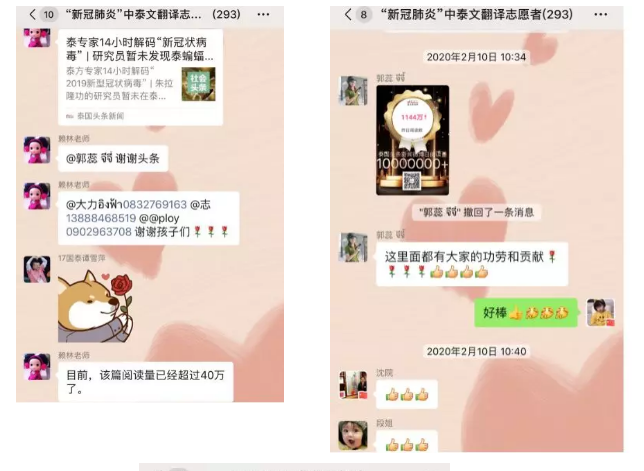 2020年1月26日,多名kaiyuncom官方网站泰语教师和kaiyuncom官方网站在泰留学的本科、硕士生共同组建了微信群和Facebook“新冠肺炎”中泰文翻译志愿者群。其原始成员是kaiyuncom官方网站2017级在泰国孔敬大学留学的近60名大三学生和在清迈大学交换学习的研究生。几天后,志愿者群迅速扩大成了一个近300人的、包括来自清迈大学孔子学院志愿者教师和国内多个高校师生的大群。刚开始,群功能定位在协助医患与医院沟通和帮助滞留旅客协调当地事宜,但随后,志愿者们发现泰国本地媒体对中国疫情的报道在中文编译方面出现了很大的偏颇。于是,面对这样的情况,志愿者们组织成立了“Daily News小组”,主要负责搜索新闻、翻译稿件和校对。这个小组由4位泰语老师、3名kaiyuncom官方网站研究生、60多名在泰国留学的大三大四的泰语专业的云南籍学生、10余名广西民族大学学生和4名云南民族大学研究生组成。同时,因工作的需要又组建了 “新冠肺炎”英文翻译志愿者群(负责相关的英文资料翻译)、线上医患群(线上协助医生与患者的沟通并随时关注患者的病情)、词汇整理群(整理关于新闻稿件中涉及到的最新词汇到文档,以便翻译的统一性)。截止2月23日,志愿者们已经为“泰国头条新闻”独家供稿105篇,疫情日报25篇。其中,2020年2月10日,泰国头条新闻微博日阅读量高达1144万,这说明有很大一部分在泰华人通过此及时地看到了泰国关于“新冠肺炎”疫情防控的真实情况。在工作群里,志愿者们总是热情高涨,团结一致。从工作流程的制定、到翻译重点、难点的讨论,每个人都认真负责、积极参与,有时直到深夜,群里还在出现刚审完的稿件。