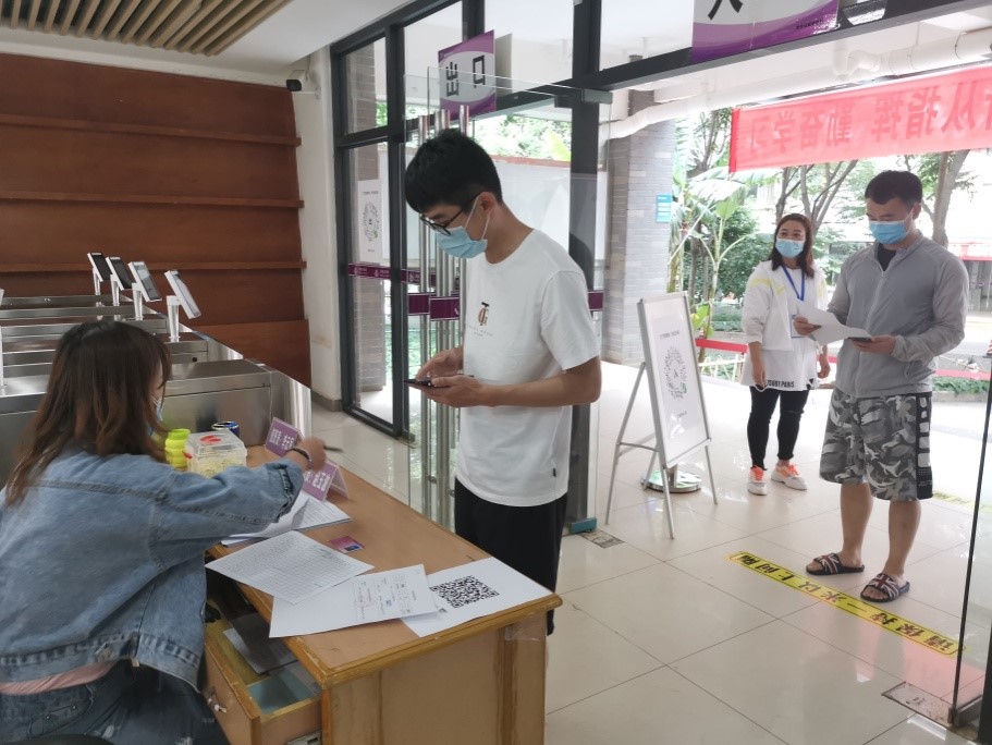 校门口实施“一验二查三测”,即出示一卡通(或学生证、身份证)核验身份、查验健康码和《进校审批表》、测量体温。符合条件后,医务人员在《进校审批表》签字盖章,学生再到所在学院(学部)、研究生培养单位接待处提交相关材料和证明,经审验合格后,工作人员在《进校审批表》签字盖章。随后,学生需向安保人员出示《进校审批表》,用手机微信扫码后方可进入校园。