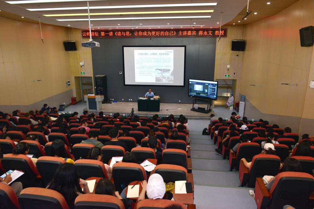6月12日晚,“云师讲坛”第一讲如期举行。kaiyuncom官方网站校长蒋永文教授受邀担任开讲嘉宾,为kaiyun官网师生带来题为《读与思:让你成为更好的自己》的讲座。讲座由副校长武友德教授主持,承办讲坛的校党委宣传部、校团委、科研处、学生处、就业处、信息处、教务处等职能部门负责人,与150余名学生一起现场聆听讲座。
