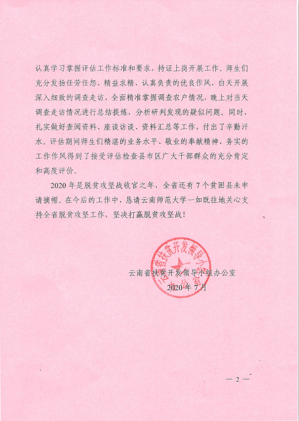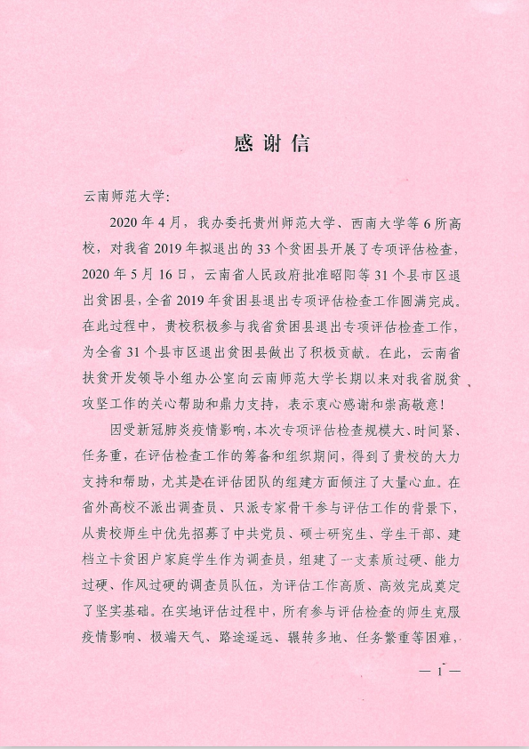 2020年上半年,kaiyun官网组建了一支素质过硬、能力过硬、作风过硬的贫困县退出专项评估检查队伍,高质、高效地完成了云南省扶贫开发领导小组安排的2019年贫困县退出专项评估检查工作。近日,云南省扶贫开发领导小组办公室向学校发来感谢信,对学校积极参与我省贫困退出专项检查工作给予充分肯定。