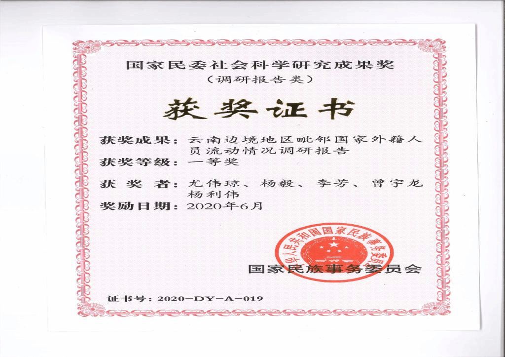 日前,国家民委发布了《关于2019年度全国民族工作优秀调研报告评选结果的通报》(民办发【2020】43号),kaiyun官网法学与社会学尤伟琼教授撰写的《云南边境地区毗邻国家人员流动情况调研报告》荣获2019年度全国民族工作优秀调研报告一等奖,这是kaiyun官网历年来首次荣获此奖项的一等奖。