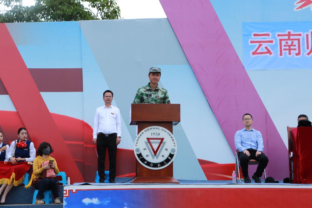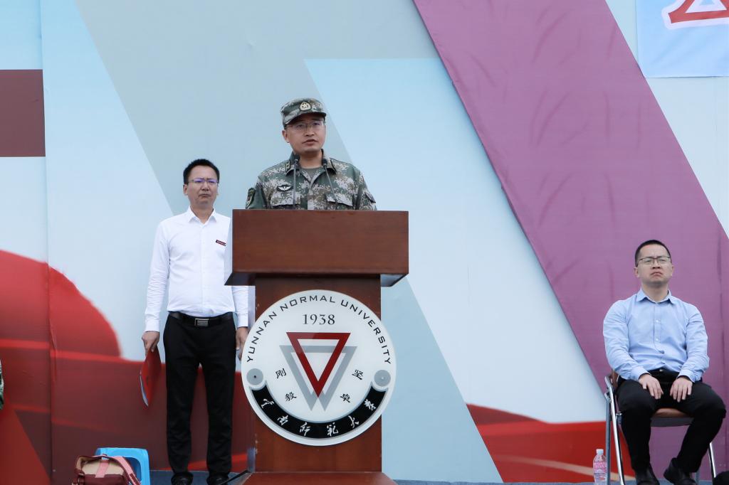 军训优秀学员代表景靖凯同学发言,向在军训期间严肃而和蔼的教官、不辞辛劳的带训教师以及在背后默默支持自己的家人表达真诚的感谢。他表示会将这次军训中学到的吃苦耐劳、自律团结、迎难而上的精神和坚强的意志品格延续到今后的学习生活中,以实际行动践行“刚毅坚卓”的校训,继承和弘扬西南联大精神,不负韶华,不负时代,做新时代有责任有担当的有为青年。