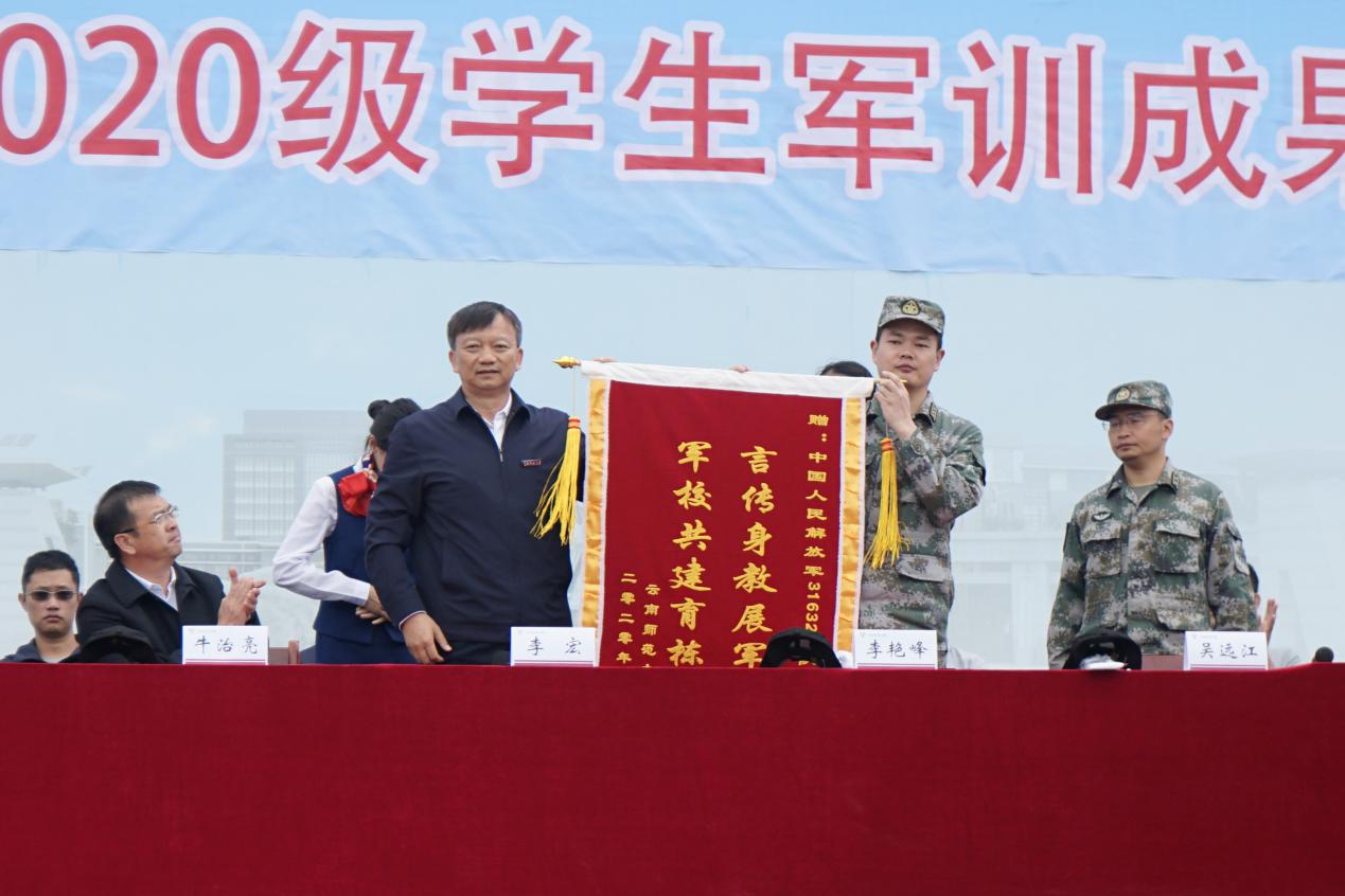 随后,李宏副书记向承训部队授予锦旗。2020级学生军训成果汇报在《中国人民解放军军歌》的激昂歌声中落幕。
