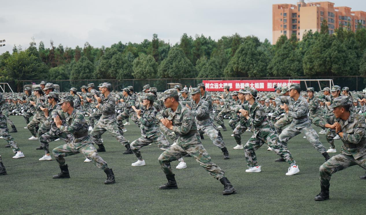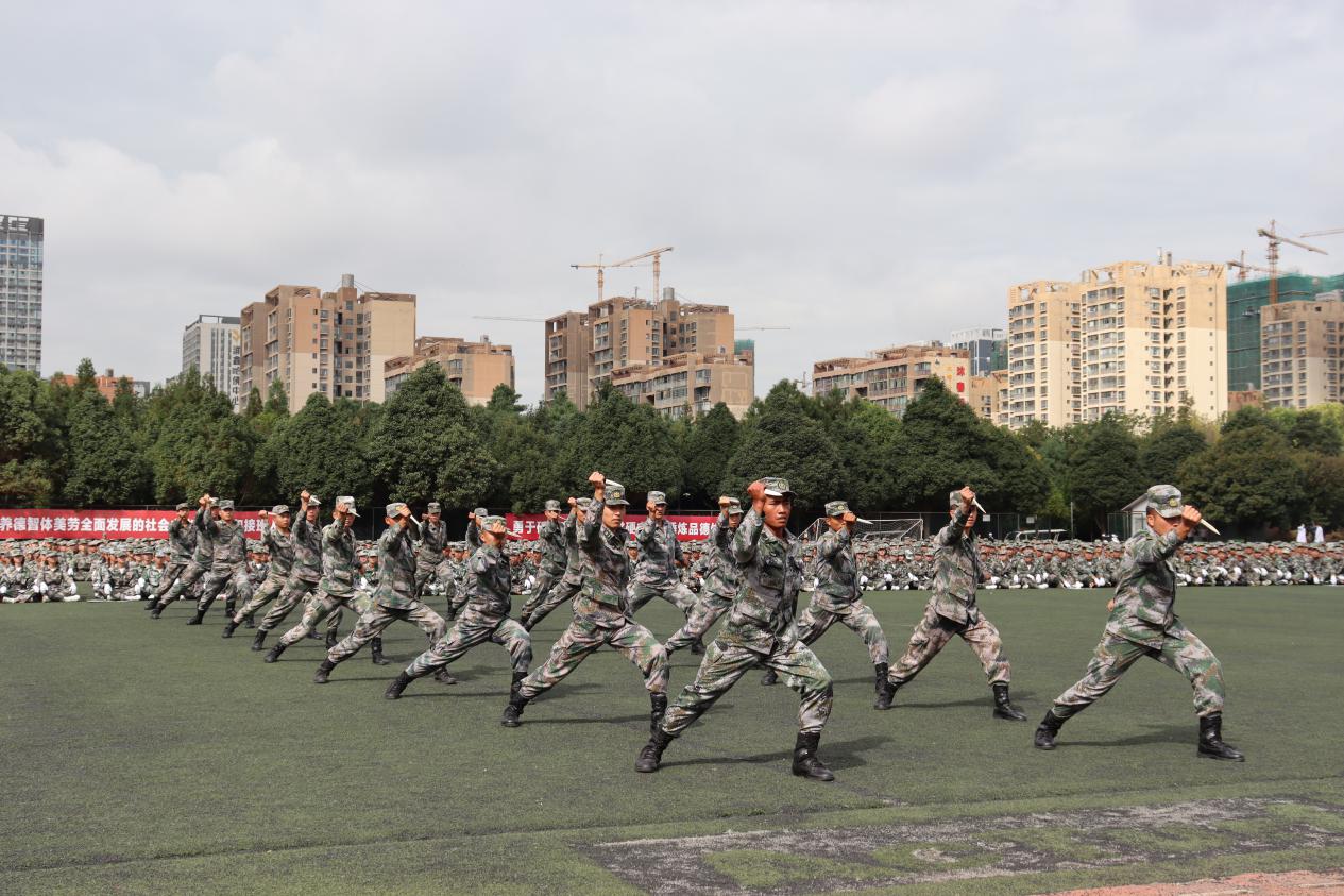 在分列式汇报中,伴随着雄壮激昂的《中国人民解放军进行曲》,各方队学生昂首阔步、英姿飒爽,迈着矫健、整齐划一的步伐划通过主席台接受检阅;学生代表和教官连队进行了军体拳表演,他们出手刚劲有力、气势如虹;教官连队进行了擒敌拳、匕首操和擒拿互搏、击膝抱摔、砸背锁喉等军事格斗演练,充分展示了中国军人坚韧刚强的意志,赢得了现场阵阵掌声。