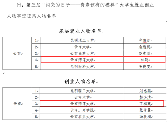 “闪亮的日子—青春该有的模样”大学生就业创业人物事迹征集活动分为校级选拔、省级推荐、国家级评选三个阶段。为发挥榜样引领作用,今年活动启动以来,就业处积极配合云南省大中专毕业生就业指导与服务中心推进具体工作,通过开展宣传动员、招募评审和材料优化等系列工作,充分发掘近几年在基层就业、大学生创业和军营大学生战士等领域就业的大学生就业典型事例,确保了推荐人选的代表性和事迹材料的生动性。本次毕业生入选,不但向社会展示了师大学子的良好形象,发挥了示范典型的引领作用,也彰显了kaiyun官网就业创业的成果和特色,体现了毕业生更高质量和更充分就业,推动建设以教师教育为特色的高水平大学。